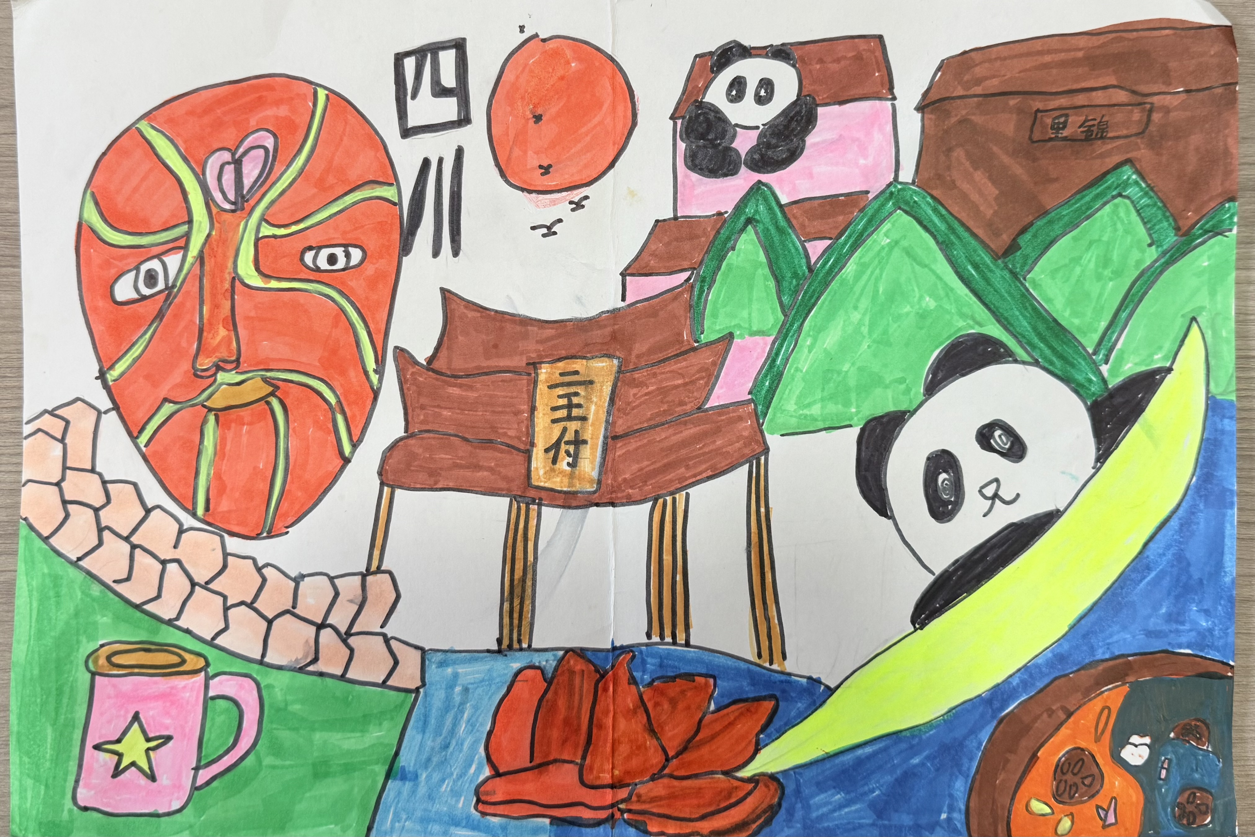 这幅画把成都的"巴适"泡进了茶里:熊猫裹着绿衫蜷在竹椅,川剧脸谱飘在檐角,盖碗茶的香缠着凉糕甜——连招牌都晃着软,每处都藏着四川的懒。 我用暖色调出茶馆的柔:熊猫的白、茶碗的粉、脸谱的红,都是这里的日常。风裹着茶香,好像一伸手就能摸到熊猫的毛、茶碗的热,听见巷里的笑。