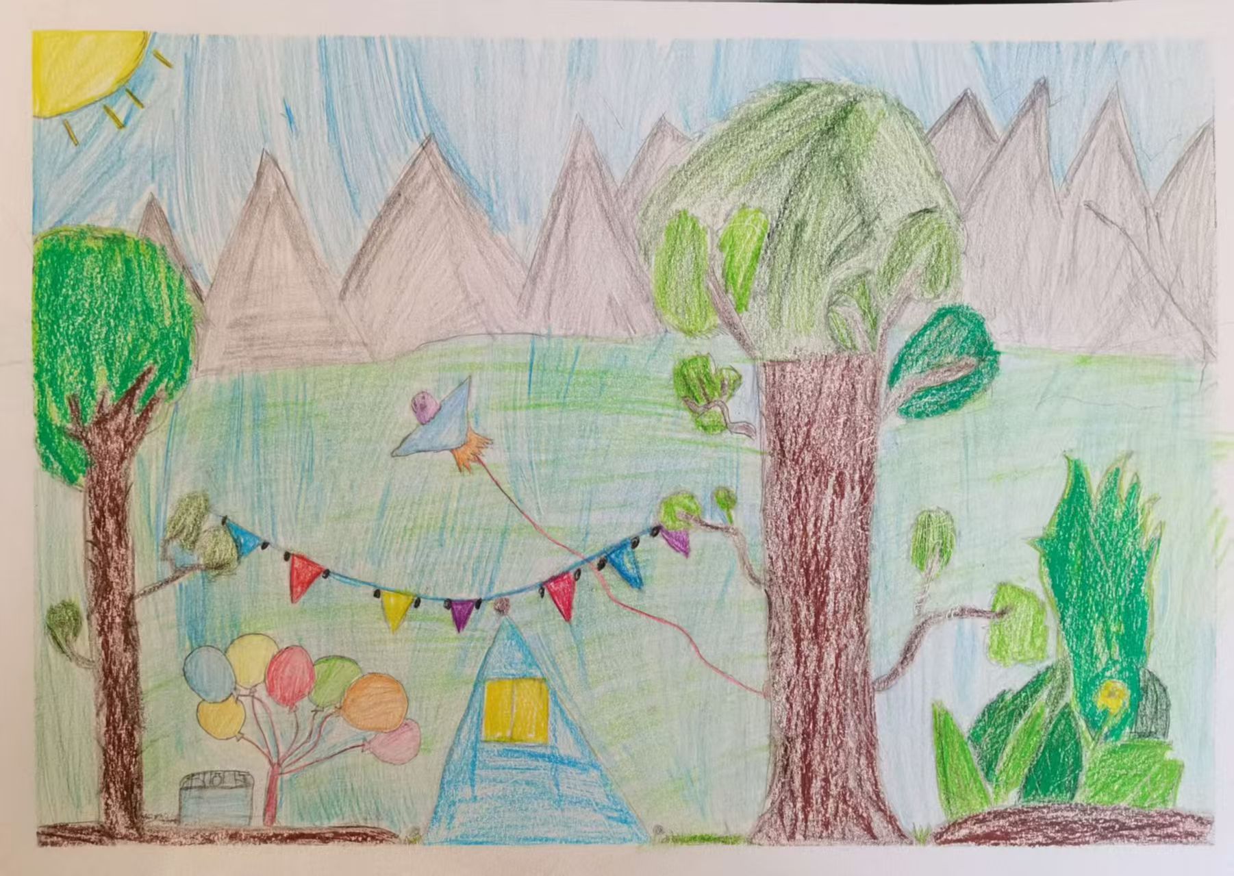 这幅儿童画展现了充满活力的户外场景:天空:右上角是黄色太阳与蓝色天空,右侧有灰色山峰。树木:有几棵树,树干棕色,树叶绿色,下方树木旁还有类似小鸟的绿色图案。装饰:左侧有带黄色窗户的蓝色建筑,旁边彩色气球和三角旗装饰的绳子,绳子上还有个小风筝。整体画面色彩鲜艳,充满童趣,营造出欢快的氛围。