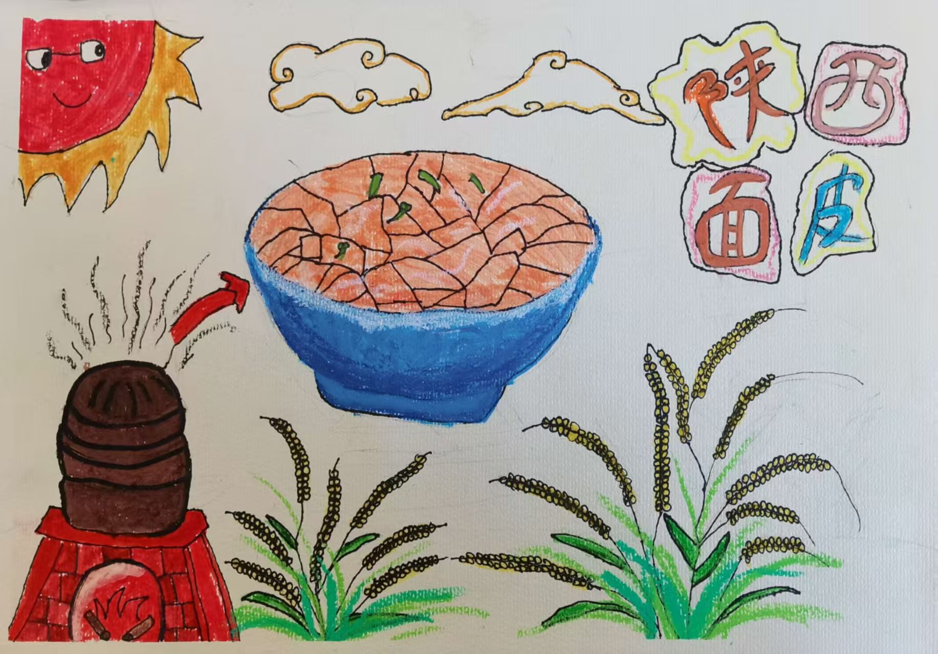 这幅画以陕西面皮为主题,画面布局:左侧是两簇带金黄谷穗的绿色植株,右上角有个带笑脸的红太阳,还有两朵云。中间上方有灶台和蒸笼,箭头指向一碗香辣面皮。右下角用艺术字写着“陕西面皮”。色彩风格:色彩鲜艳,用红、黄、绿、蓝等色,太阳、云朵、植株、餐具等形象生动,整体风格童趣活泼,通过灶台、谷物、面皮等元素,展现陕西面皮的制作关联与地域美食特色。