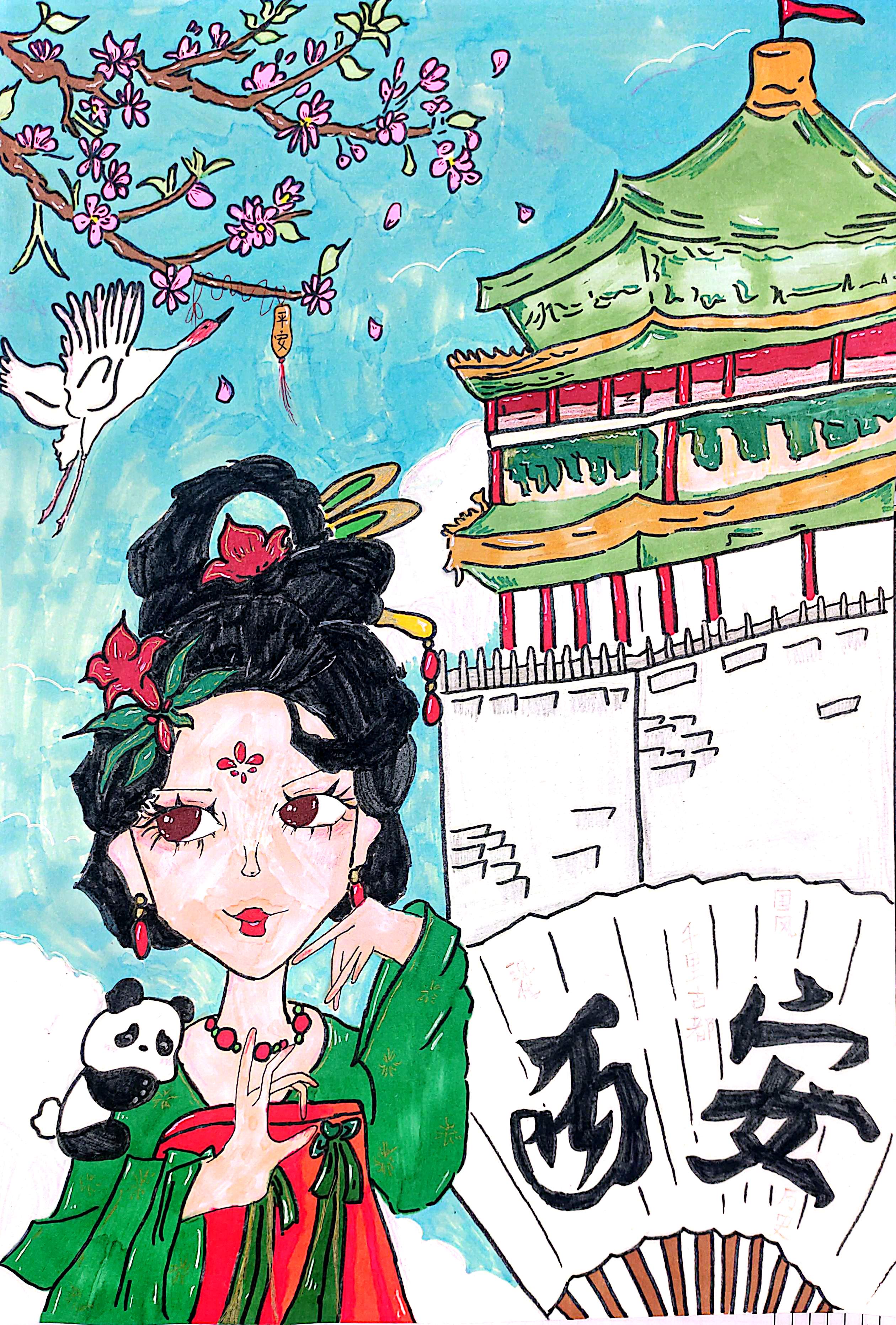 名称:《长安古韵》 这幅画展现西安魅力,身着唐装的女子尽显古韵,身旁熊猫添灵动。背景里,繁花飘落、仙鹤翱翔,西安标志性建筑巍峨矗立,"西安" 折扇点明主题,融合历史与自然元素,传递出西安深厚的文化底蕴与独特的城市风情,是古今交融的诗意呈现 。