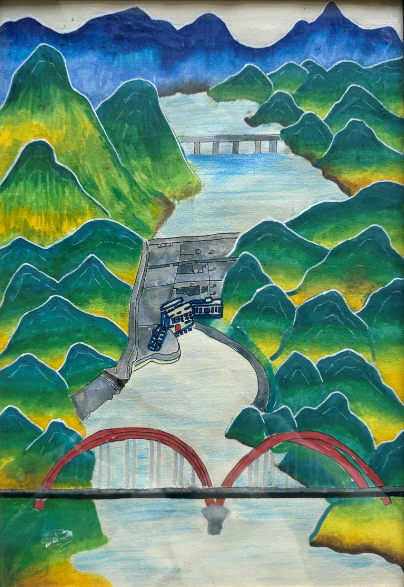 这幅画以青绿山水为底色,绘出层叠山峦间的水库风景,既有江河的清澈,也有红拱桥梁的传统形制,色彩明快的色块让山水与交通建筑相融,展现出自然与人文、传统与现代共生的图景。自然生态的美景让人流连忘返,有请一同来欣赏。