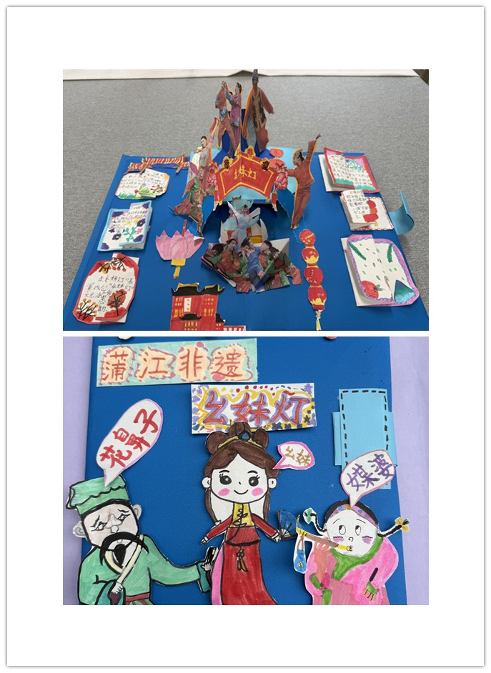 这是立体非遗主题创作,聚焦"幺妹灯"民俗:层叠剪纸还原了表演者的服饰与姿态,红灯笼、中式建筑元素衬出年节氛围,旁附文字介绍非遗背景。立体造型让表演场景鲜活起来,把传统民俗的热闹与文化传承的细节,都凝在这方蓝色底板上。呈现蒲江非遗"幺妹灯":红装幺妹、花鼻子、媒婆的形象鲜活可爱,"蒲江非遗"幺妹灯"字样点明主题,红灯笼点缀出民俗氛围。简洁的人物造型与对话气泡,让非遗民俗的角色特点与趣味,变得直观又生动。