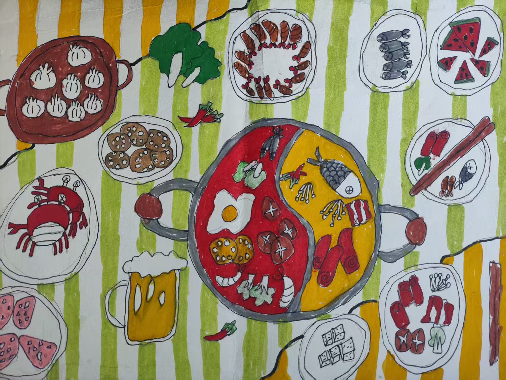 这幅画选 "地方特色" 类别,聚焦重庆火锅这一标志性美食符号。画面以太极鸳鸯锅为核心,围绕着小笼包、卤味、西瓜等川渝餐桌常见食饮,用斑斓笔触铺陈山城聚餐的热闹烟火。火锅是重庆 "地方特色" 的味觉名片 —— 红汤的热辣是巴渝性情,食材的丰饶是市井生活,围坐的食俗是地域烟火气的具象。我想通过这幅餐桌图景,把重庆人 "以锅会友、以食共情" 的生活底色,转化为直观的视觉记忆,让地方特色在热气腾腾的餐桌里鲜活起来。
