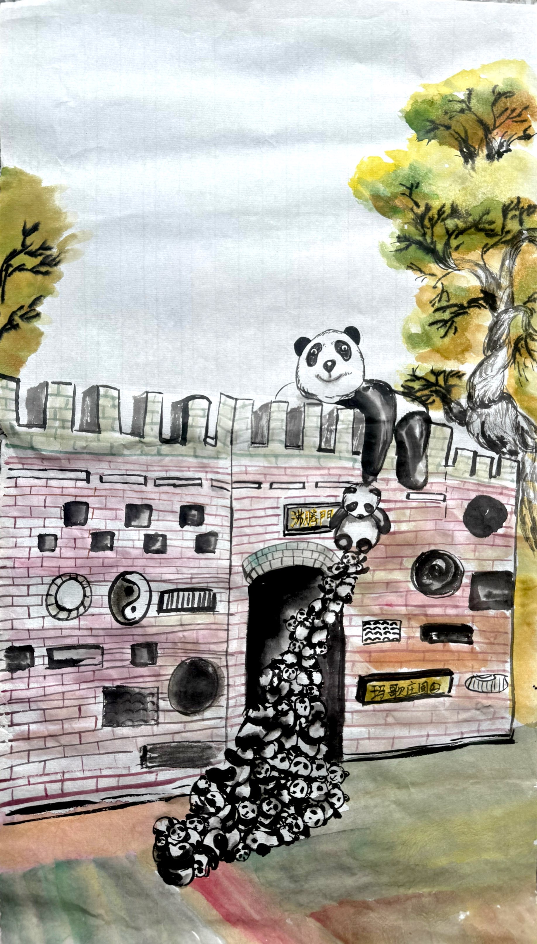 这幅国·画以古城门(成都沸腾门)为背景:粉红砖墙嵌着"拱极门"玛歌庄园"标识,成群熊猫从城门涌出、攀上墙垛,银杏叶晕染出秋意。将国宝熊猫与古城建筑结合,憨态可掬的形象让厚重的城垣多了活泼的烟火气,彰显了古蜀建筑的韵味。