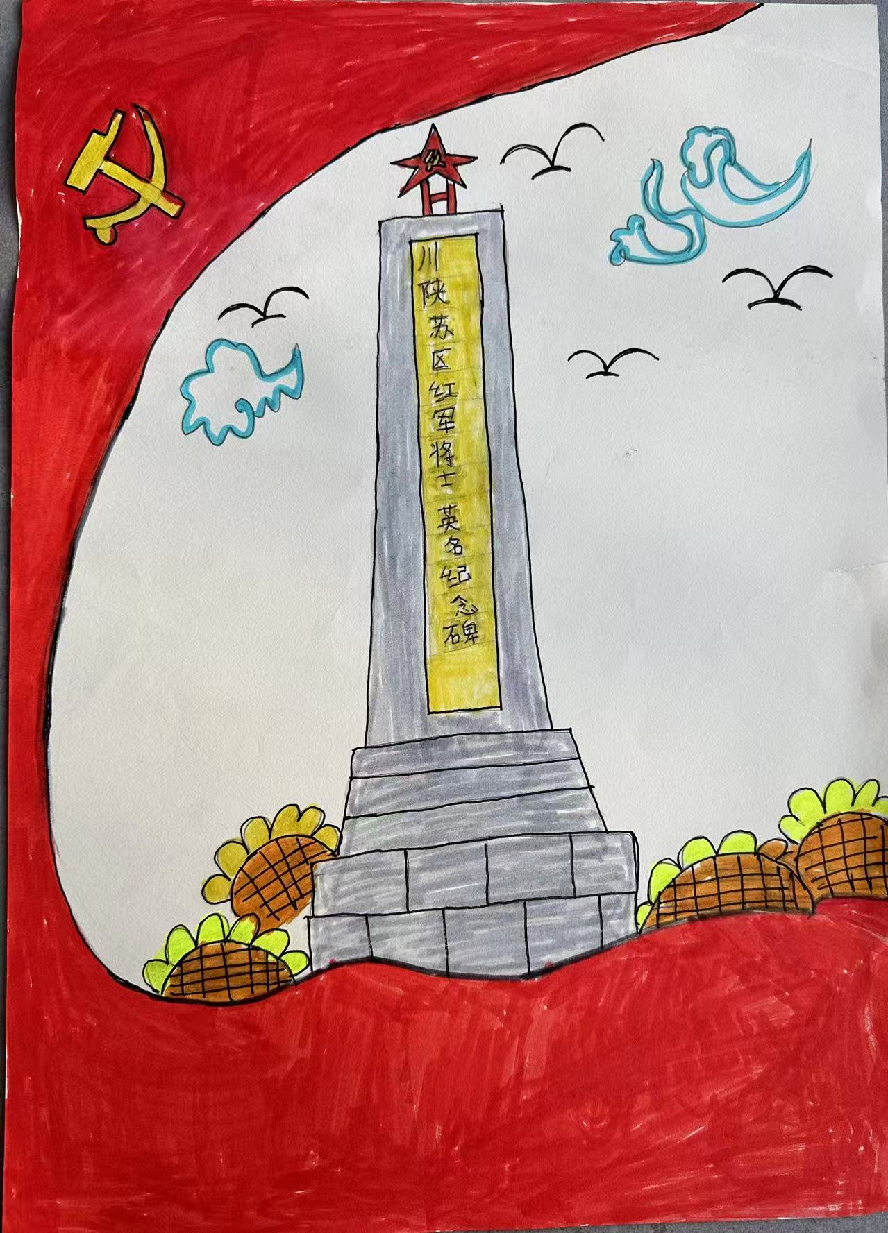 它绘的是巴中川陕苏区红军将士英名纪念碑:碑身镌刻英烈名录,顶嵌红星,旁衬党旗,是巴中红色地标之一。巴中作为川陕革命根据地核心区,超12万儿女投身革命,此碑凝注着"智勇坚定、排难创新"的红军精神,红绸与葵花更衬出巴山儿女对英烈的敬仰。