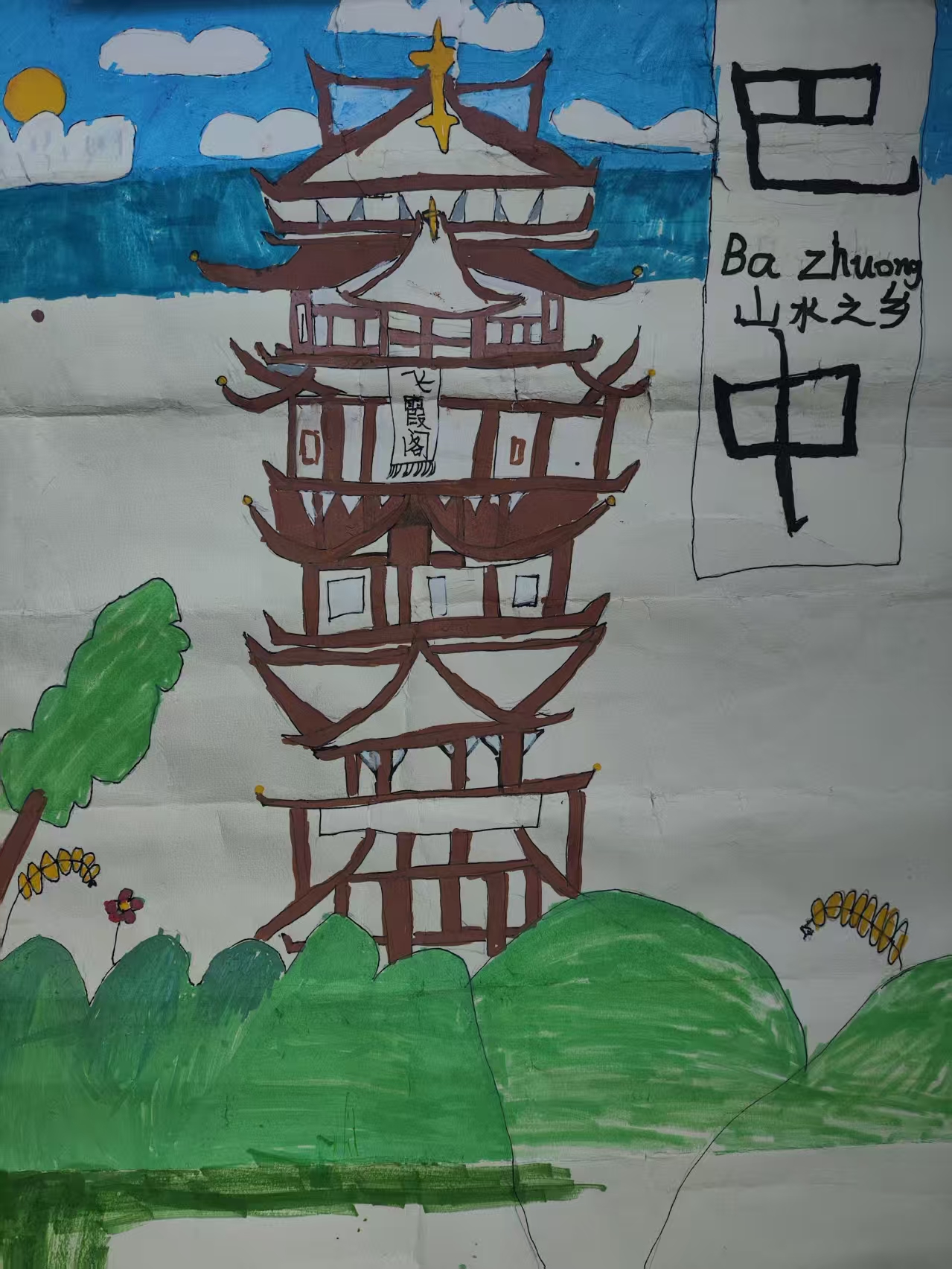 本作品选择 "地方特色" 参赛类别,以巴中标志性建筑 "飞霞阁" 为核心意象。画面中,多层歇山顶楼阁巍峨矗立,金黄塔刹直指苍穹,匾额 "飞霞阁" 三字点明身份,搭配 "巴中"山水之乡" 字样强化地域属性。青绿山水环绕楼阁,旭日祥云点缀天际,既展现了巴中山水交融的自然风貌,也凸显了人文建筑与生态环境的和谐共生。通过浓墨重彩的手绘风格,将历史建筑的庄重与自然山水的灵秀结合,让 "地方特色" 在建筑地标与地域文化的交织中立体呈现,传递对本土人文遗产的珍视与赞美。