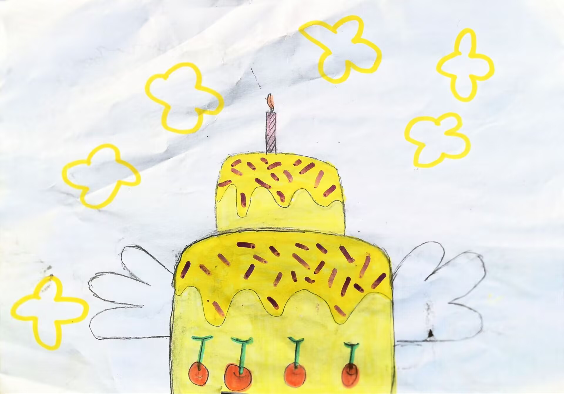 大家好!我画的是《龙吟甜糕・生态果香》哦!这是咱们龙吟家乡的甜糕,上面的樱桃都是咱们这儿山上长的生态果子!来龙吟旅游,除了看小亭子和花,还能吃用本地新鲜果子做的甜糕,可好吃啦!我们要爱护山上的果树,不随便摘没熟的果子,这样就能一直吃到甜甜的果子啦!快来我家乡玩,尝甜甜的生态甜糕,看龙吟的美景,一起当爱护果树的小能手!