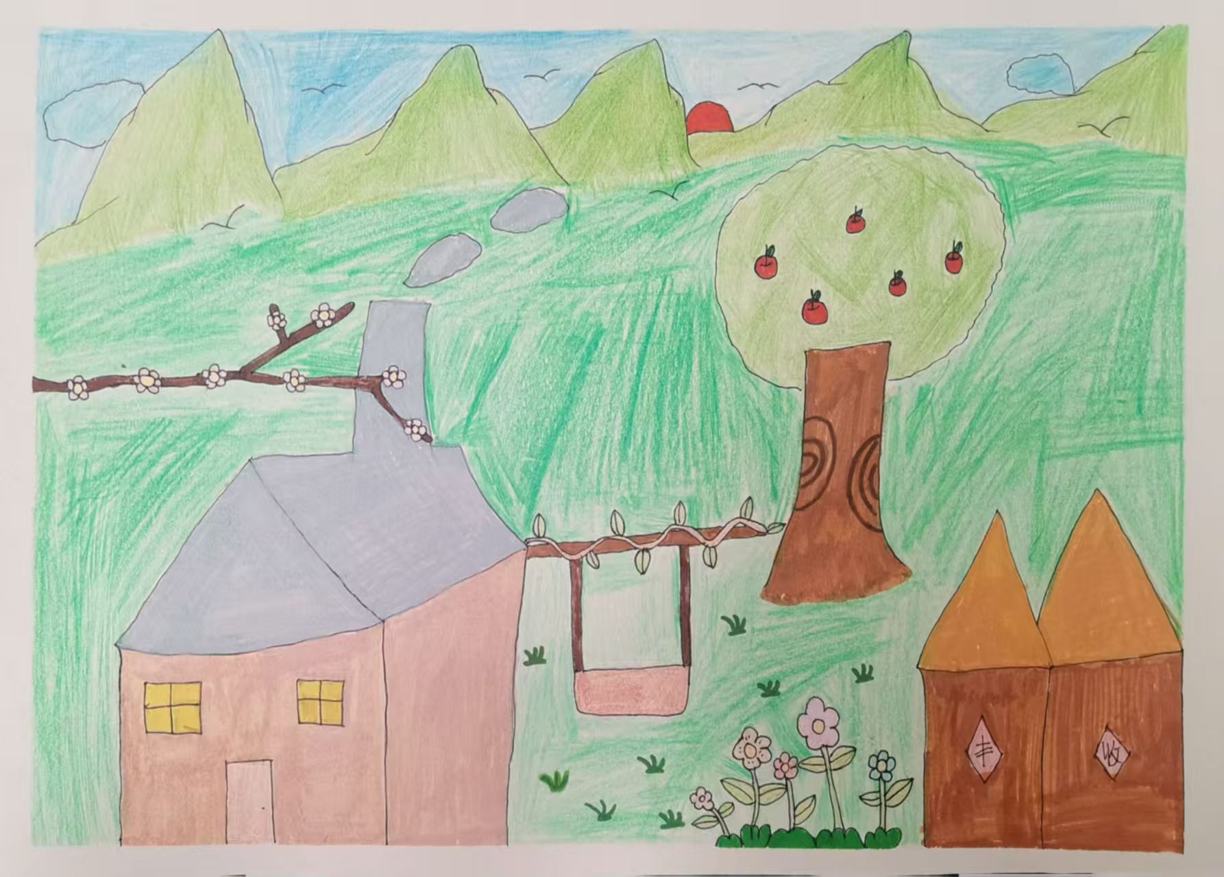 这幅画呈现了一处田园风光:画面左侧有两栋房子,上方的房子是浅棕色墙体、灰色屋顶,带黄色窗户;下方的房子为棕黄配色,墙面上有粉色装饰。中间区域是大片绿色草地,设有一个秋千,还有一棵结满红果子的树和一枝开着白花的树枝。右侧是连绵的绿色山峦,天空中有云朵和红日,左下角则点缀着花草,整体色彩明快,充满童趣,展现出乡村的宁静美好。