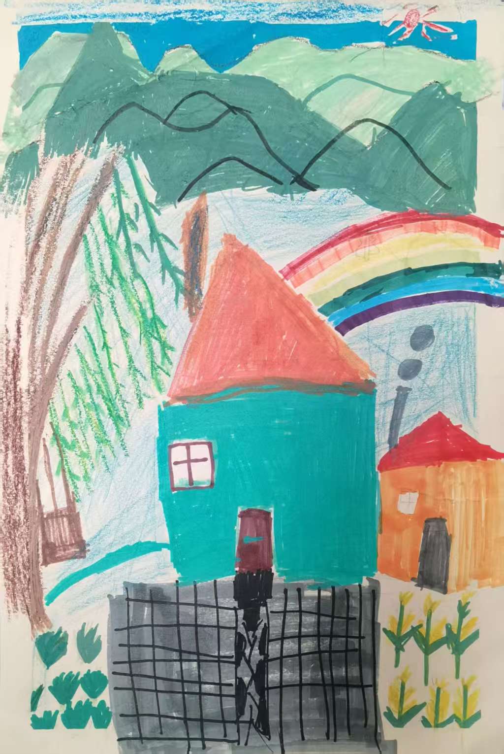 这幅画是一幅充满童趣的风景画,可分为上下两部分。上半部分展现了户外自然与建筑:背景是蓝天、绿山和带光芒的太阳,山间有彩虹;中间有两棵树,左侧是垂柳,右侧有房屋,其中一栋绿墙红顶,另一栋橙墙红顶,还有灰色道路和栅栏。下半部分是几座房屋,色彩明快,有黄、蓝等色,搭配绿色草地,整体色彩鲜艳,充满童真,描绘了一个美好温馨的家园场景。
