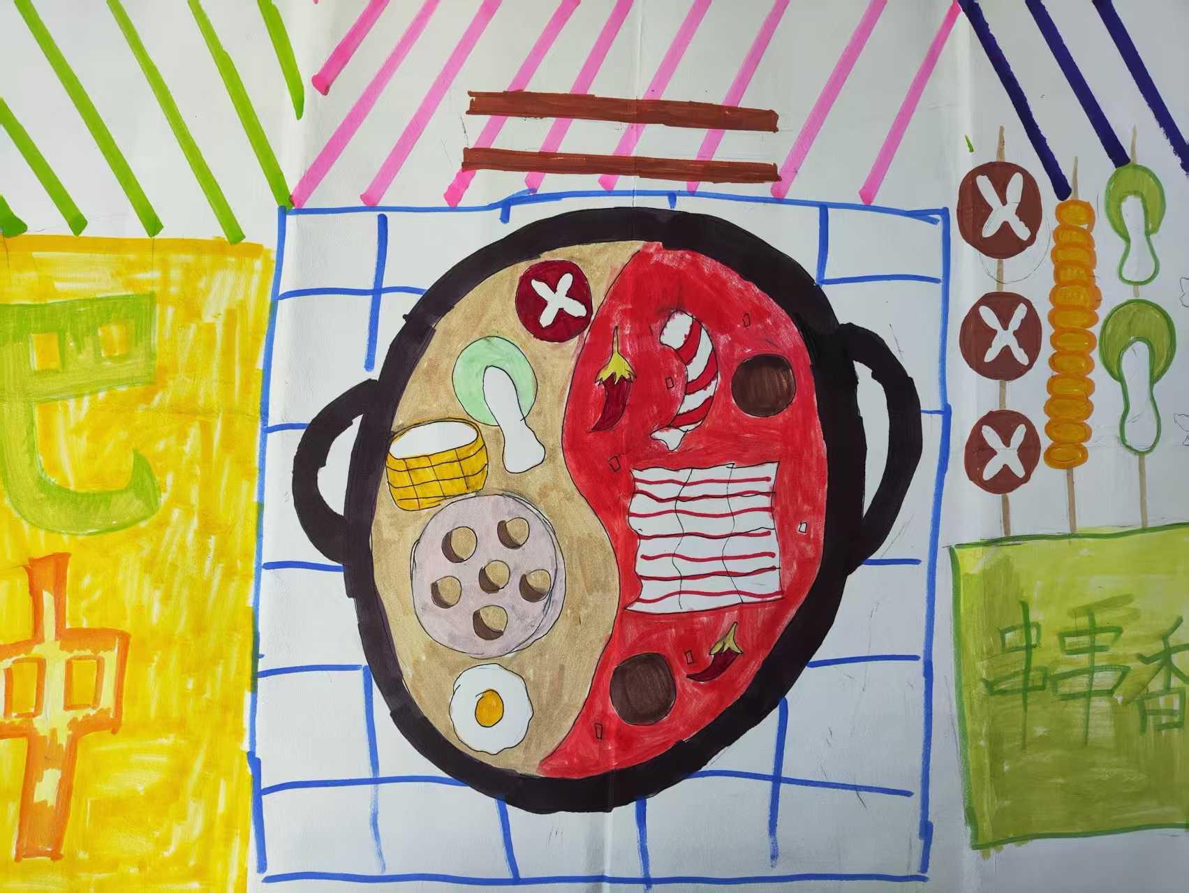 以 "巴中本土饮食" 为核心,通过视觉元素整合与场景营造实现表达: 用 "巴中" 字样明确地域属性,以鸳鸯火锅、烤串等符号聚焦本土饮食特色; 借助餐布、餐具等细节构建用餐场景,增强生活真实感; 以鲜明色彩与手绘风格,将 "地域标识 + 美食符号 + 生活场景" 融合,既突出巴中饮食的辨识度,也传递出本土市井生活的烟火氛围,体现 "饮食即生活" 的地域文化表达逻辑。