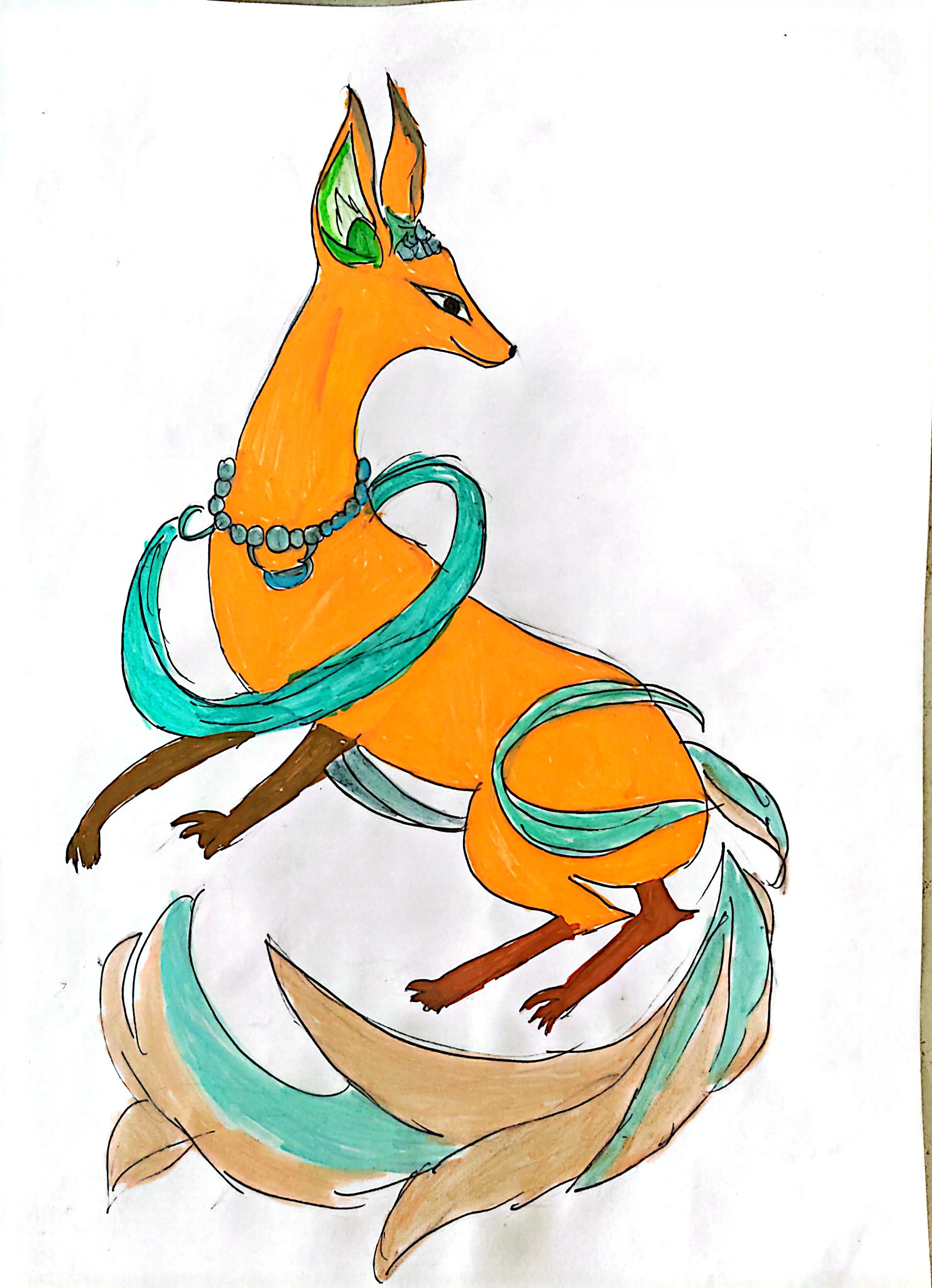 提取西北民俗中的"灵狐"意象,狐身飘带取敦煌飞天的韵律,颈间"绿松石串珠"复刻藏地饰品元素,尾羽纹样取陇东皮影的曲线造型。暖橙底色呼应西北沙漠的色调,青蓝飘带暗喻丝路商道的"流动"意象,既让灵狐承载地域的奇幻民俗,也借装饰细节织就西北文化的交融网络,鲜活传递地域民俗的灵动与厚重。