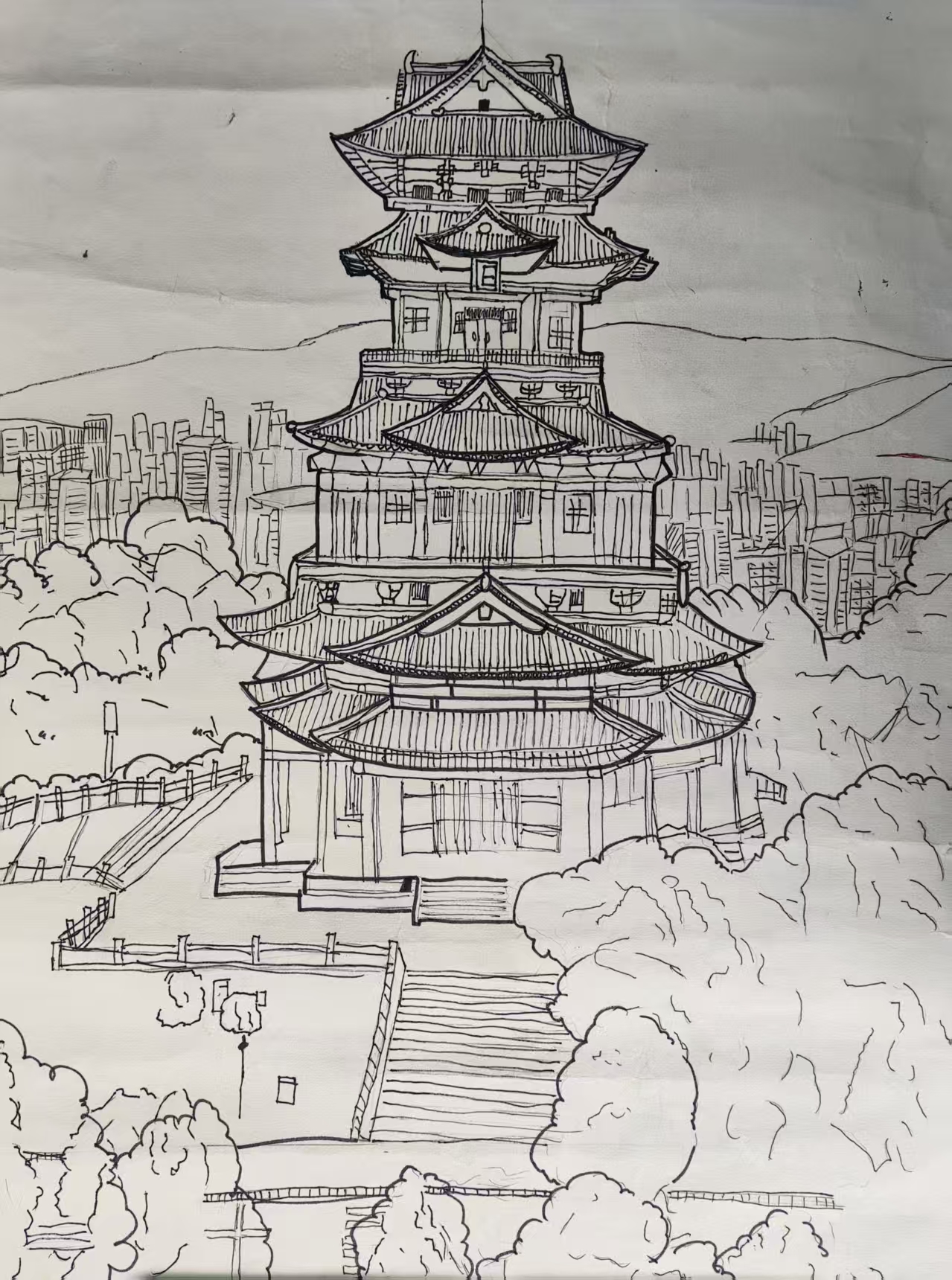 以 "飞霞阁" 为核心载体,通过 "建筑细节 + 环境层次" 实现表达: 精准刻画飞霞阁的传统建筑形制(多层翘角、木构纹理),锚定巴中地域人文标识; 以城市建筑群、山峦植被为背景,还原地标所处的真实环境,展现巴中 "传统建筑与现代城市、自然山水交融" 的城市风貌; 采用黑白线描风格,既突出建筑的结构美感与细节质感,也通过环境层次的铺垫,强化 "古今共生、城景相融" 的地域特色表达逻辑。