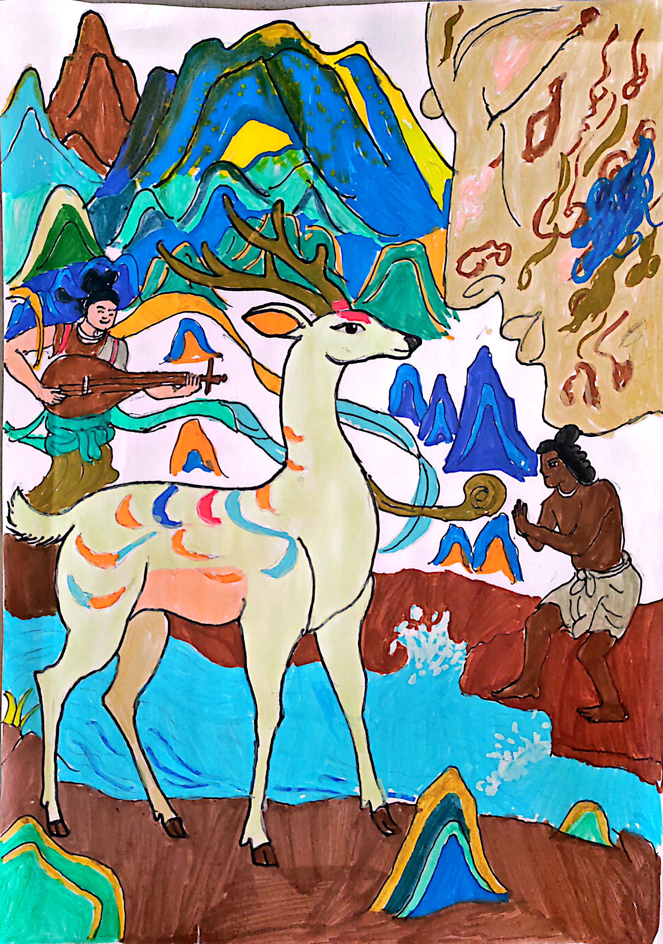 以敦煌壁画"九色鹿救溺"故事为原型,鹿身纹样复刻莫高窟的"鹿王本生"壁画细节,人物服饰取西域胡商的窄袖形制,乐器琵琶是丝路文化的典型载体,背景山水晕染呼应河西走廊的地貌。画面既还原了经典壁画的叙事性,也借鹿、人、乐的互动,具象化丝路商道里"互助共生"的文化交融,让西北的自然生灵与人文历史同频共振。