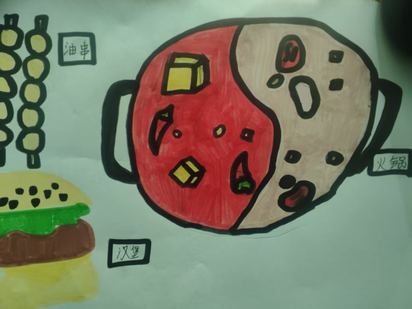 以 "市井美食" 为核心,通过 "本土风味 + 日常饮食" 的元素组合实现表达: 用火锅、油串锚定川渝本土饮食特色,突出地域风味辨识度; 融入汉堡拓展饮食类型,体现日常饮食的多元性; 借助手绘拼绘形式,将 "本土美食、日常小吃" 整合,既传递出川渝市井的烟火氛围,也体现饮食文化的包容性与生活感。