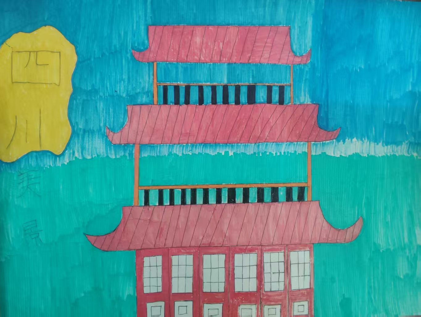 以 "四川传统楼阁" 为核心,通过 "建筑形态 + 地域标识" 实现表达: 用 "四川"美景" 字样锚定区域与主题属性,以多层翘角楼阁体现四川传统建筑风貌; 借助色彩分层的背景与建筑细节刻画,突出川派楼阁的视觉特色; 以手绘风格将 "地域标识、传统建筑" 整合,既突出四川传统建筑的风貌辨识度,也传递出本土人文建筑所承载的地域文化氛围。