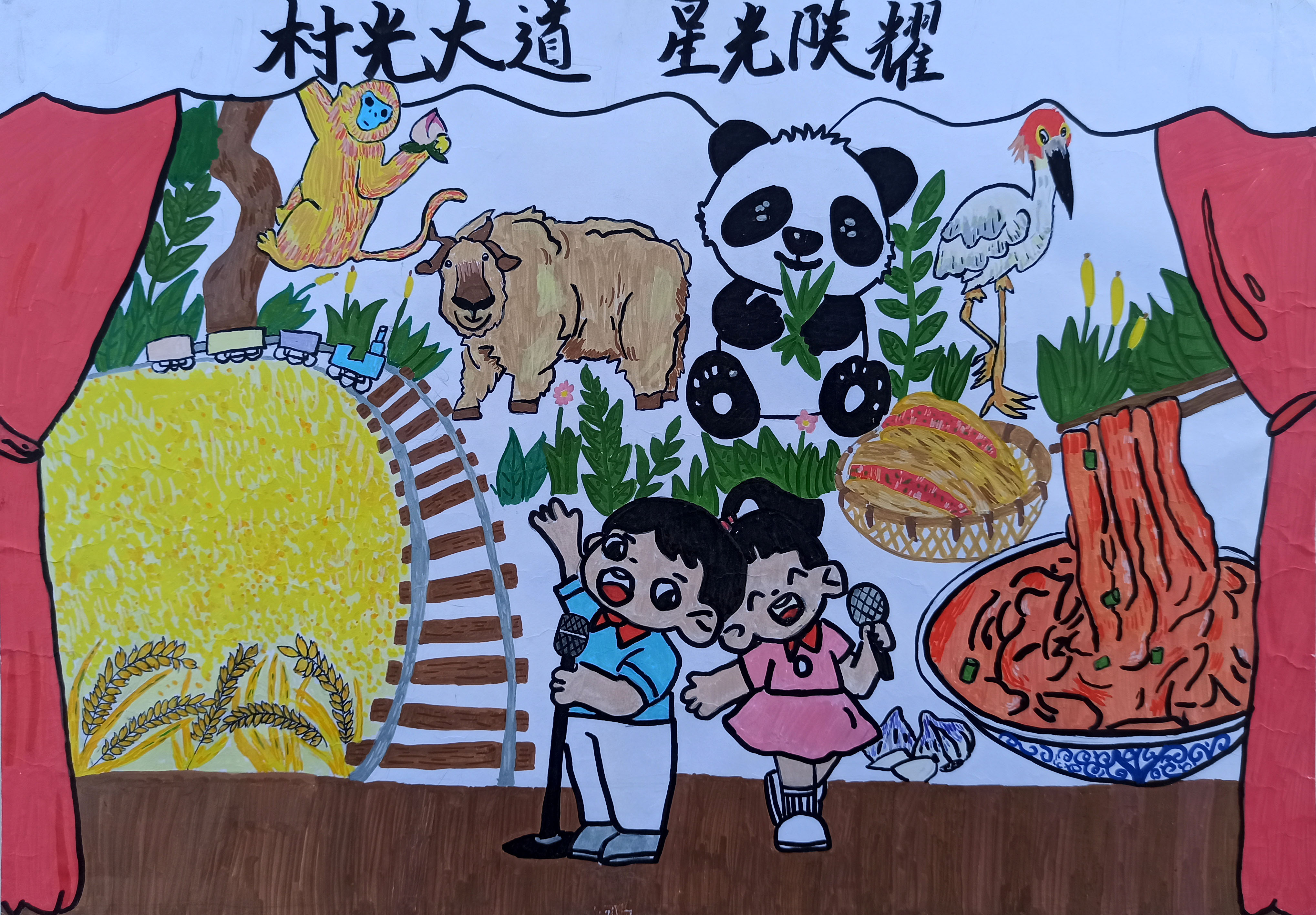 作品以 "村光大道 星光闪耀" 为引,勾勒出宁陕 "生态与生活共生" 的鲜活图景。画面中,秦岭特有的金丝猴、羚牛、熊猫、朱鹮自在栖息,是宁陕作为 "生物基因库" 的生态底色;金黄的稻田、地道的美食,是这片土地滋养出的生活烟火;孩童的欢唱与穿梭的小火车,则串联起宁陕的自然之美与人文温度。创作将宁陕的生态禀赋与乡土气息交融,既展现了这里 "山水养万物" 的自然馈赠,也传递出当地人在守护生态中收获的幸福。旨在以童趣的画面,定格宁陕 "生态为底、生活为韵" 的独特印象 —— 它不仅是动植物的乐园,更是人与自然共织的 "星光村落",让每一缕村光里,都藏着生态守护的温暖,也藏着生活向上的光亮。