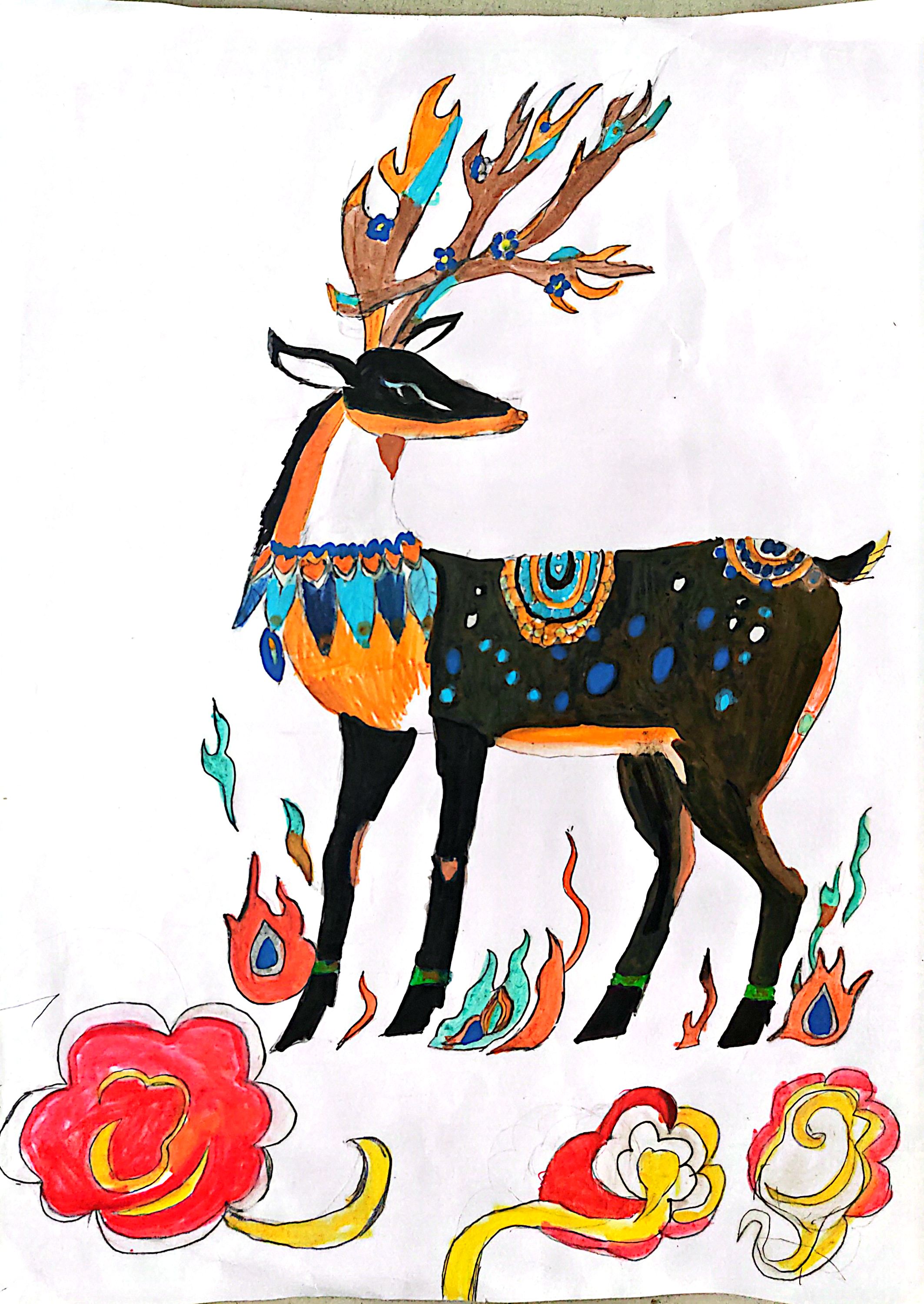 聚焦西北高原特有麈鹿,鹿角纹样取敦煌藻井的缠枝纹,颈间装饰复刻藏族"嘎乌"配饰元素,周身火焰纹呼应西北"祭火"传统,脚下祥云取陇东民间剪纸的曲线造型。色彩浓烈且装饰繁复,既还原了高原生灵的灵秀,也将敦煌美学、藏地民俗、陇东剪纸等西北文化符号交织,凝成独属地域的文化鲜活感。