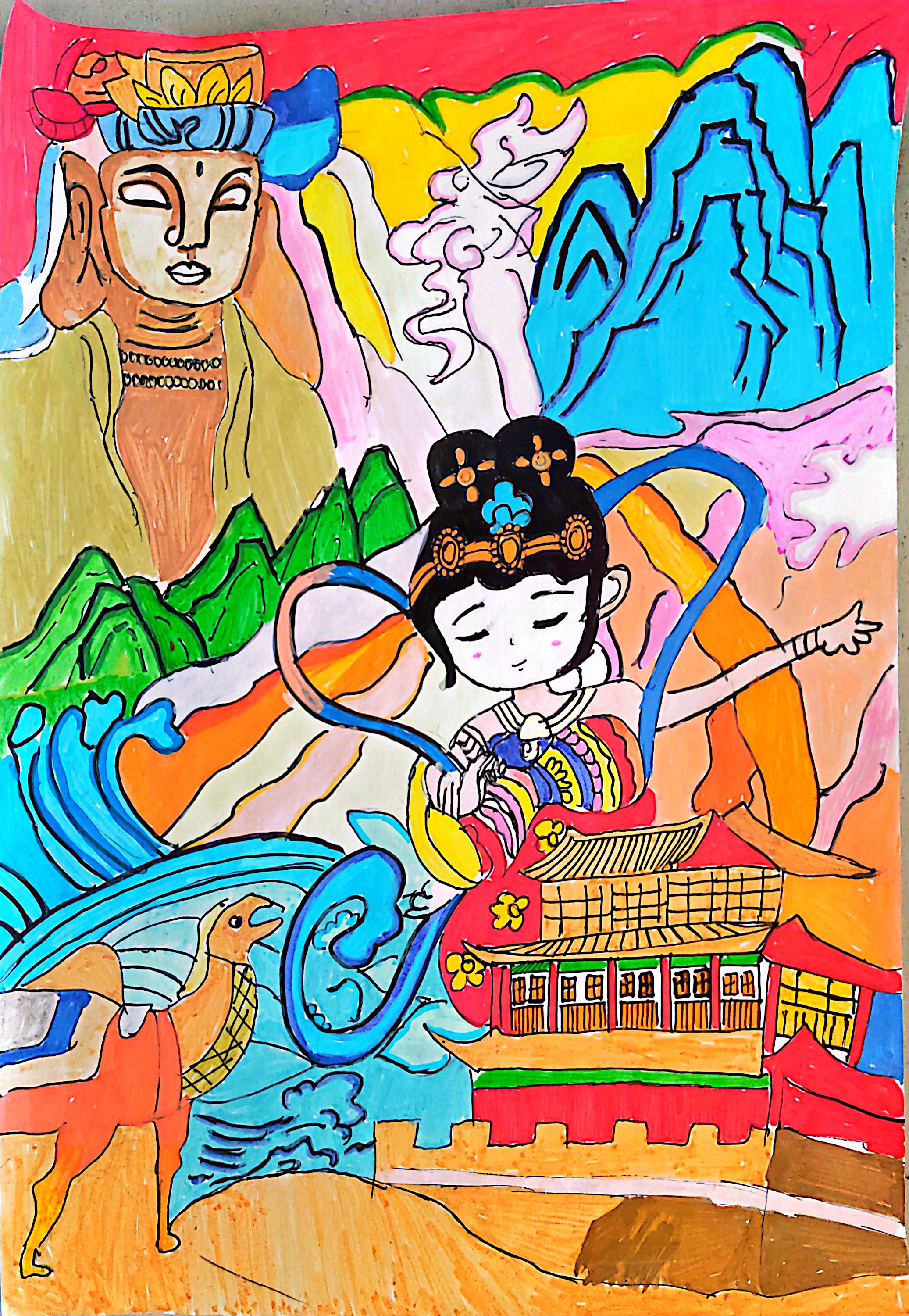 以敦煌大佛造像为背景,飞天造型取莫高窟的"供养天"形制,服饰纹样复刻壁画的联珠纹,带翼骆驼是丝路文化的"神兽"意象,古建是河西走廊的传统夯土楼阁。色彩浓烈贴合西北艺术特质,大佛暗喻宗教文化的浸润,驼铃呼应商道的喧嚣,既藏住敦煌文化的厚重,也呈现丝路作为"文明纽带"的多元气质。