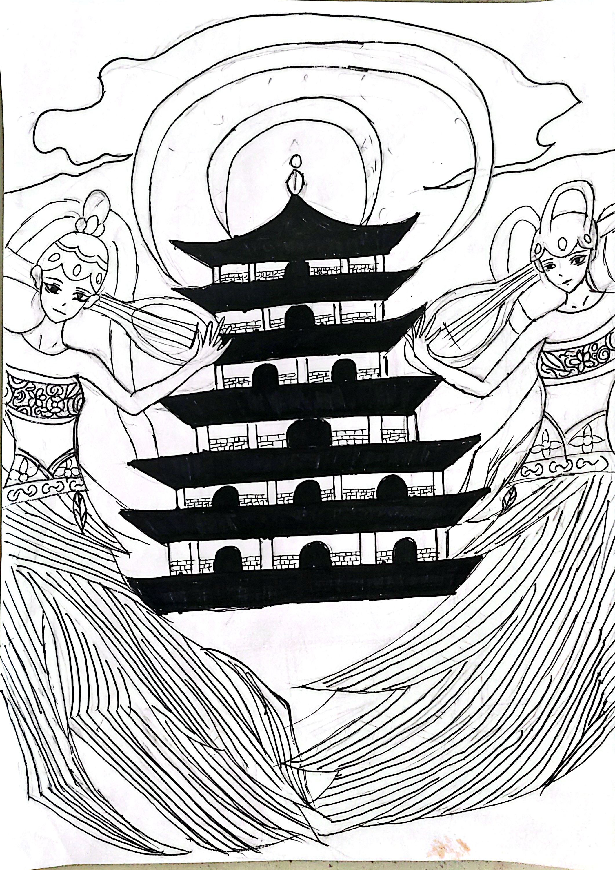 画面中的两位女性是敦煌飞天的经典造型,发髻、飘带及服饰纹样均借鉴了敦煌壁画的艺术特征,手持乐器的姿态体现了飞天"乐舞供养"的传统意象。 - 建筑元素:背景的多层楼阁为中式传统塔楼(如佛塔或阁楼),其层叠飞檐、拱门设计呼应了敦煌莫高窟建筑的形制,传递出"佛国仙境"的空间氛围。