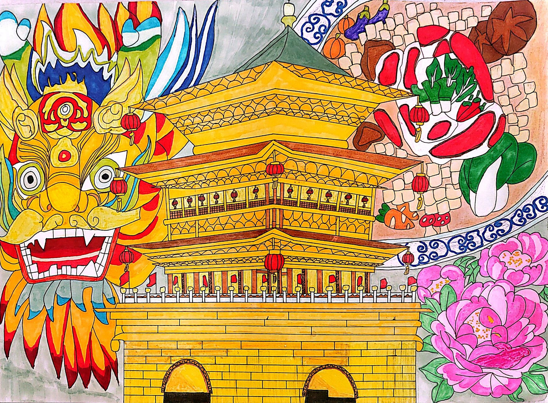 这幅画以"盛世古建的国潮织锦"为核:鎏金重檐的楼阁复刻中式建筑的雍容,左侧瑞兽(狮/龙)带着传统图腾的威严,右侧牡丹、灯笼与祥云纹样,叠合出富贵吉祥的文化意象,浓烈的色彩裹着国潮美学的张力。 它把传统符号揉作视觉盛宴:古建是文明的载体,瑞兽是精神的图腾,花卉纹样是审美的底色,每一处元素都锚定中式美学的厚重——既显古建的堂皇,又以国潮画风让传统符号鲜活起来,像把"盛世的文化底气"铺在了画里。