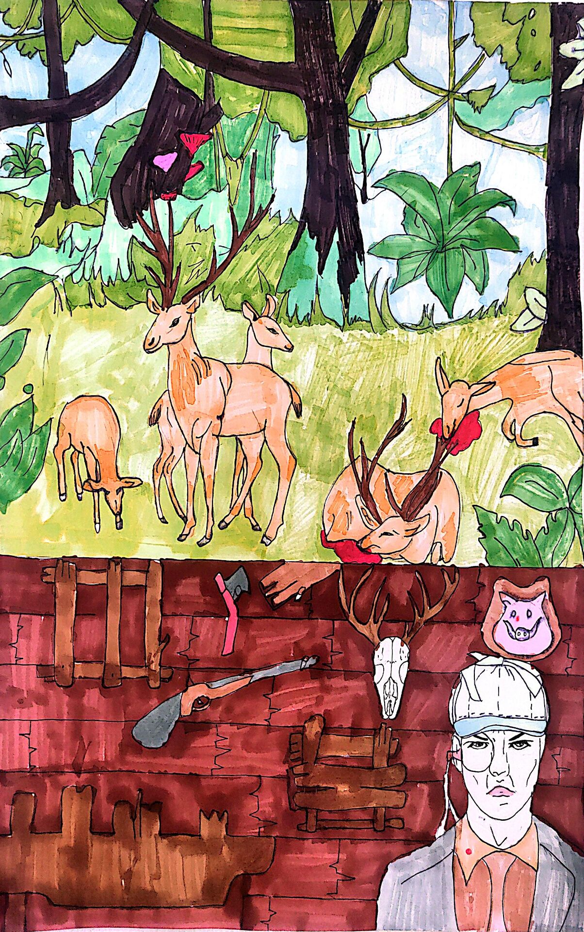 这幅画以"自然与人类的对立镜像"为核:上半区是密林间麋鹿悠然的生机图景,下半区是猎具、动物头骨与人类形象的冷峻画面,上下的割裂感精准戳中生态冲突的命题。 它用强烈的视觉反差,把"生存与掠夺"具象化:麋鹿的温柔是自然的本真,猎具的冷硬是人类的干预,既以鲜活的生灵唤起对自然的共情,又以沉重的符号警示生态破坏的代价,让环保的命题在冷暖色调的碰撞里有了直击人心的张力。