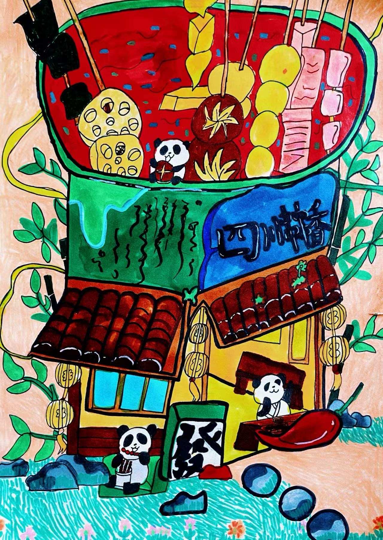 这幅名为《四川串串香》的童画,展现了一个三年级小朋友眼中热气腾腾的美食盛宴。小画家用鲜艳的红色与金黄色作为主色调,描绘出沸腾锅底里翻滚的辣椒与香料,每一串食材都挂着亮晶晶的红油,仿佛在邀请观者一起品尝。 画面中央,长短不一的竹签串着藕片、牛肉、毛肚等丰富食材,错落有致地插在锅里,像极了一个个勇敢的跳水运动员。背景里简笔画出的餐馆招牌、冒着的热气,还有同桌食客笑脸,都让整幅画充满了市井生活的烟火气。 通过大胆的色彩和充满动感的构图,小画家不仅记录了四川串串香的色香味,更传递了与亲友围坐分享的温暖快乐。