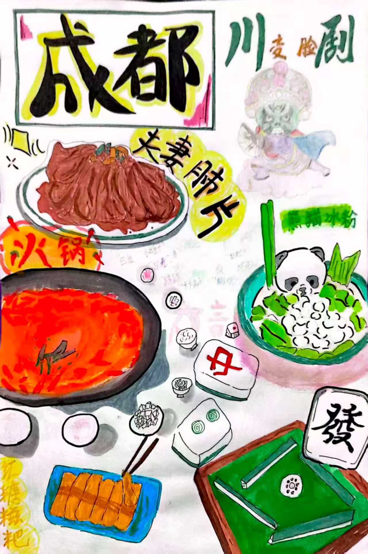 以"成都生活美学"为核心,把城市标签拆解成最鲜活的日常碎片:用火锅、夫妻肺片、红糖糍粑的热辣甜香,锚定成都"美食之都"的味觉记忆;熊猫冰粉、川剧脸谱勾连本土文化符号,麻将"中"發"则是成都悠闲烟火气的具象化。整体以色彩浓烈的手绘风格,把美食、文化、市井生活揉进同一张画面,让"成都"不再是抽象地名,而是能闻见香气、触到松弛感的生活现场。