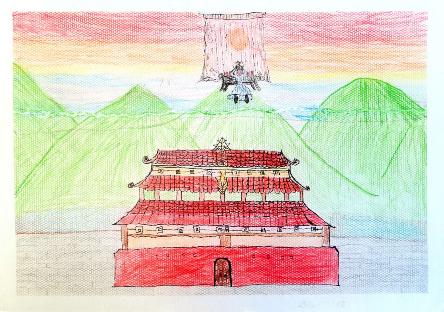 这幅画描绘了古楼及周边场景:左侧是红色的城楼,屋顶、墙体色彩鲜明,细节处有传统建筑装饰;中间是大片绿色山峦,线条勾勒出山体轮廓;右侧天空呈红橙黄渐变的霞光效果,还有人物、类似旗帜或布幔的元素,整体风格偏向儿童画,色彩明快,展现出对古楼及相关场景的艺术化呈现,传递出对这一标志性建筑的描绘与想象。