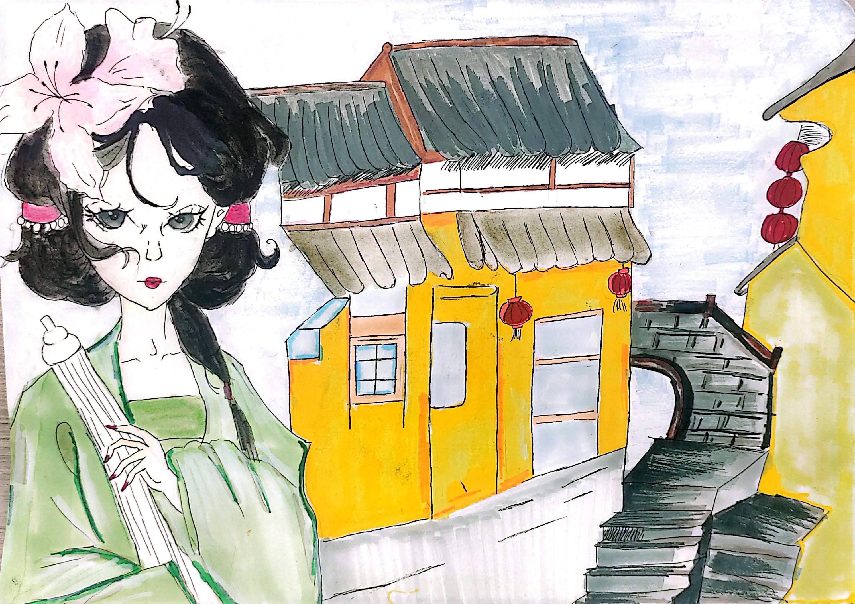 名称:《古巷琴韵》 画面中,身着绿衣的古典女子,发髻簪花,手持古琴,似要弹奏悠悠曲调。背景是古雅的中式建筑,黄墙黑瓦、红灯点缀,石板小径蜿蜒,尽显江南古巷韵味。传统服饰与建筑相融,传递出古典文化的静谧与优雅,仿佛在诉说一段旧时光里的诗意故事,让人沉浸于古雅的氛围之中 。