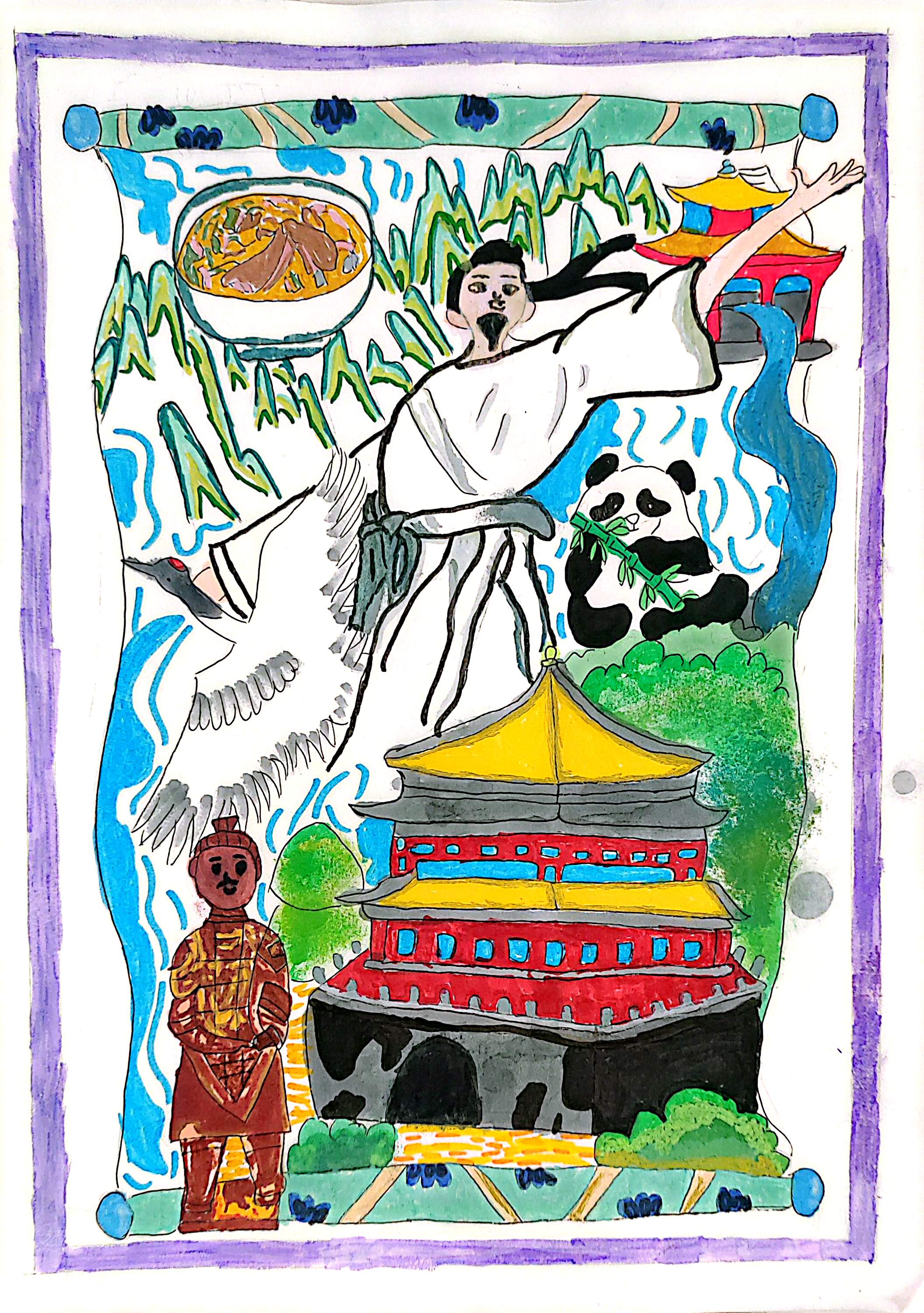 名称:《华夏盛景图》 这幅画汇聚华夏元素,身着古装的文人雅士,身旁白鹤相伴,尽显诗意;憨态可掬的熊猫抱竹,传递自然生机;兵马俑、传统建筑,承载历史厚重;特色美食与山水呼应,展现风土人情。用童趣笔触串联文化符号,绘出一幅传统与自然交融、饱含民族底蕴的多彩长卷,诉说对华夏大地的热爱 。
