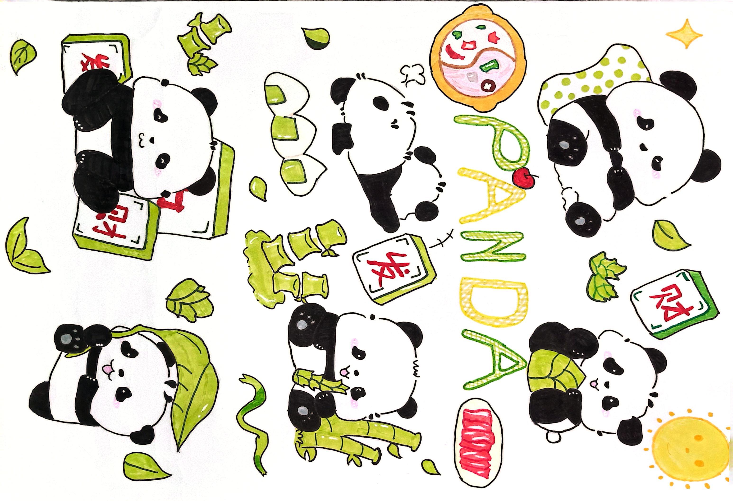 作品介绍:我的作品绘画了6只熊猫,有着各种状态:打麻将、吃笋、撑伞等。这些都体现了我的家乡成都。成都人爱打麻将,每当过年,人们总是聚在一起打麻将,极为欢乐。撑伞是体现成都的天气总是阴雨绵绵的。同时我还加入了火锅等元素,体现我家乡的特色菜品。以绘画表达了我对家乡的热爱。
