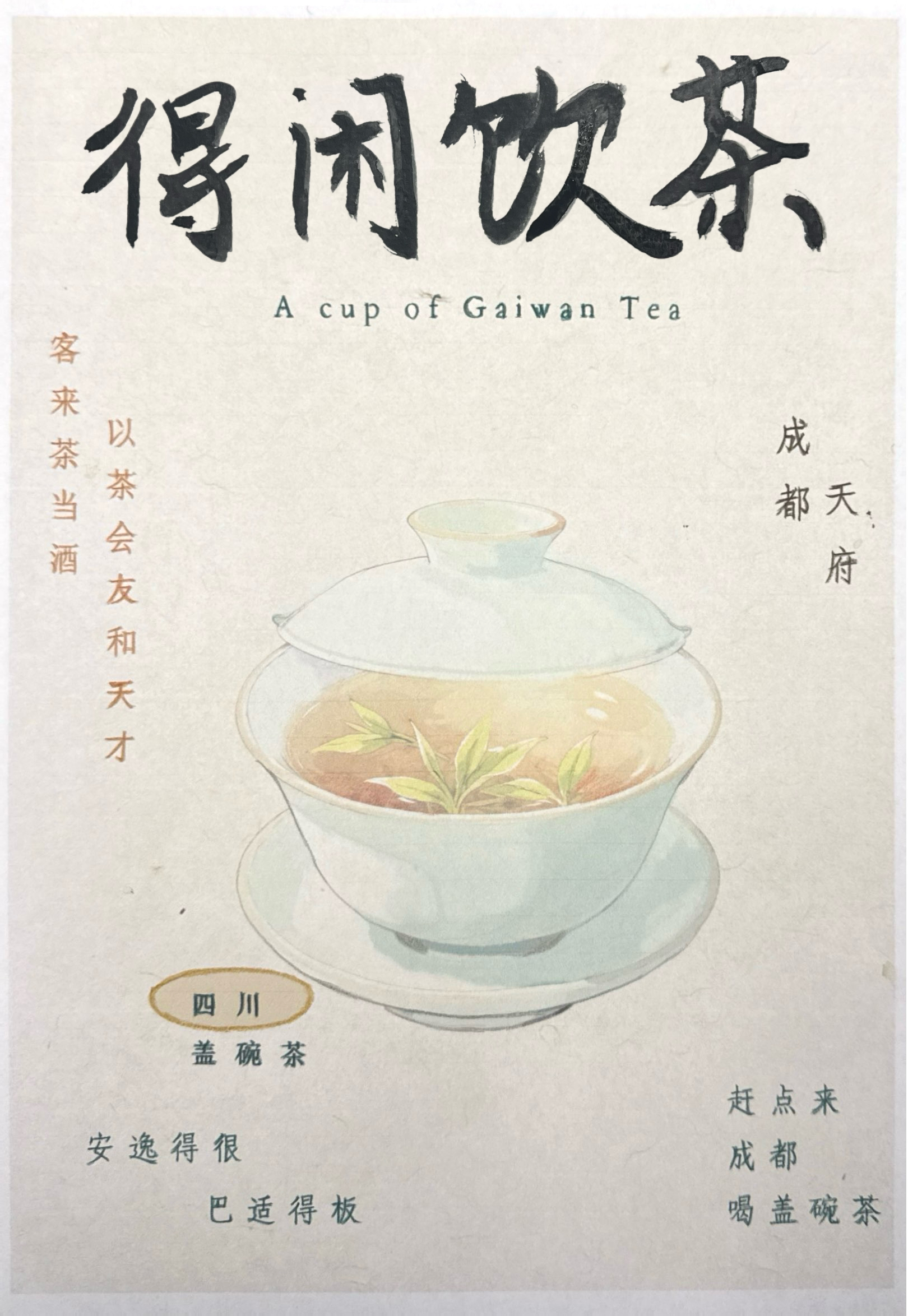 视觉锚点:以水彩质感的盖碗茶为核心,还原四川盖碗"三才碗"(盖为天、碗为人、托为地)的形制,茶汤里舒展的茶叶既显茶味鲜活,也暗合"慢下来"的生活节奏。 文字呼应:用书法字"得闲饮茶"点明主题,搭配"客来茶当酒"安逸得很"等川渝方言与茶俗谚语,既保留地域文化标识,也让松弛的市井氛围更具象;"天府成都"四川盖碗茶"则强化地域属性。 氛围营造:做旧纸张底色+轻复古排版,弱化商业感,让海报像老友递来的"茶约邀请",传递四川人"以茶会友、把日子过巴适"的生活哲学。