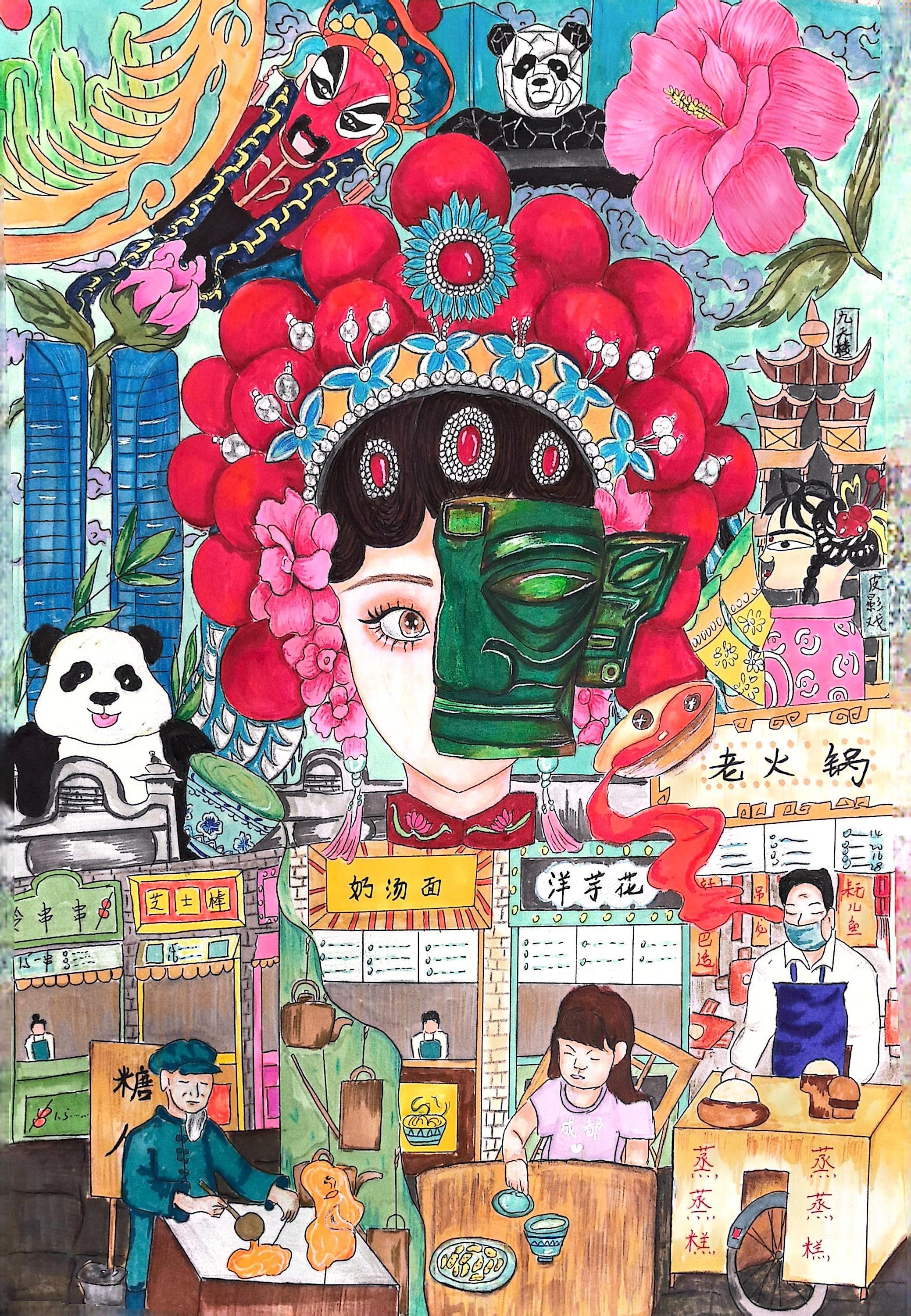 这幅是把成都的"古、今、潮.烟火"相融合.以"半"川剧脸和半三星上堆面具"为核心串联熊猫、川剧、古蜀文明符号.又铺陈老火钙、糖画、盖碗茶的市井烟火,以及像蒸蒸糕、冷串串等成都小吃、皮影戏和"九天楼"与现仪"双子上塔"和"成都IFS能猫"相碰撞.暖色调衰药蓉城的热闹与巴适.