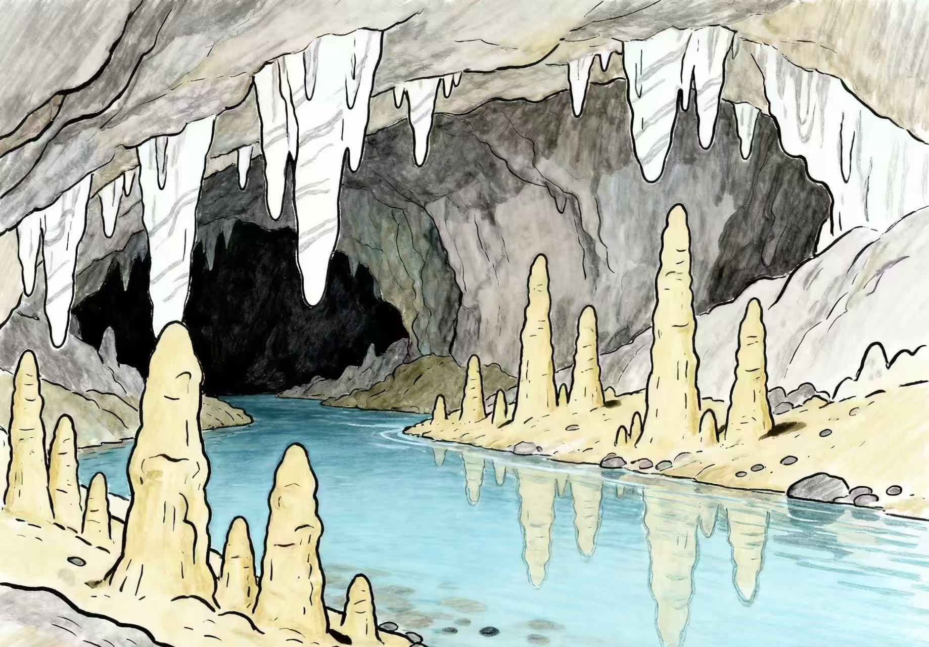 将溶洞这一静态景观,转化为一个承载着"流动的时间"与"静谧的生命"的剧场。 创作者通过光影的交织、实景与倒影的呼应,试图在画布上实现一种"刹那永恒"的意境——即在最幽深静谧之处,让你亲眼"看见"时间如何以最缓慢的速度流淌,并最终沉淀为最坚硬的物质。这幅画不仅是对自然奇观的赞美,更是一次关于时间、存在与感知的沉思。它邀请观者驻足,在"幽岩"的寂静中,感受"流光"的震撼。