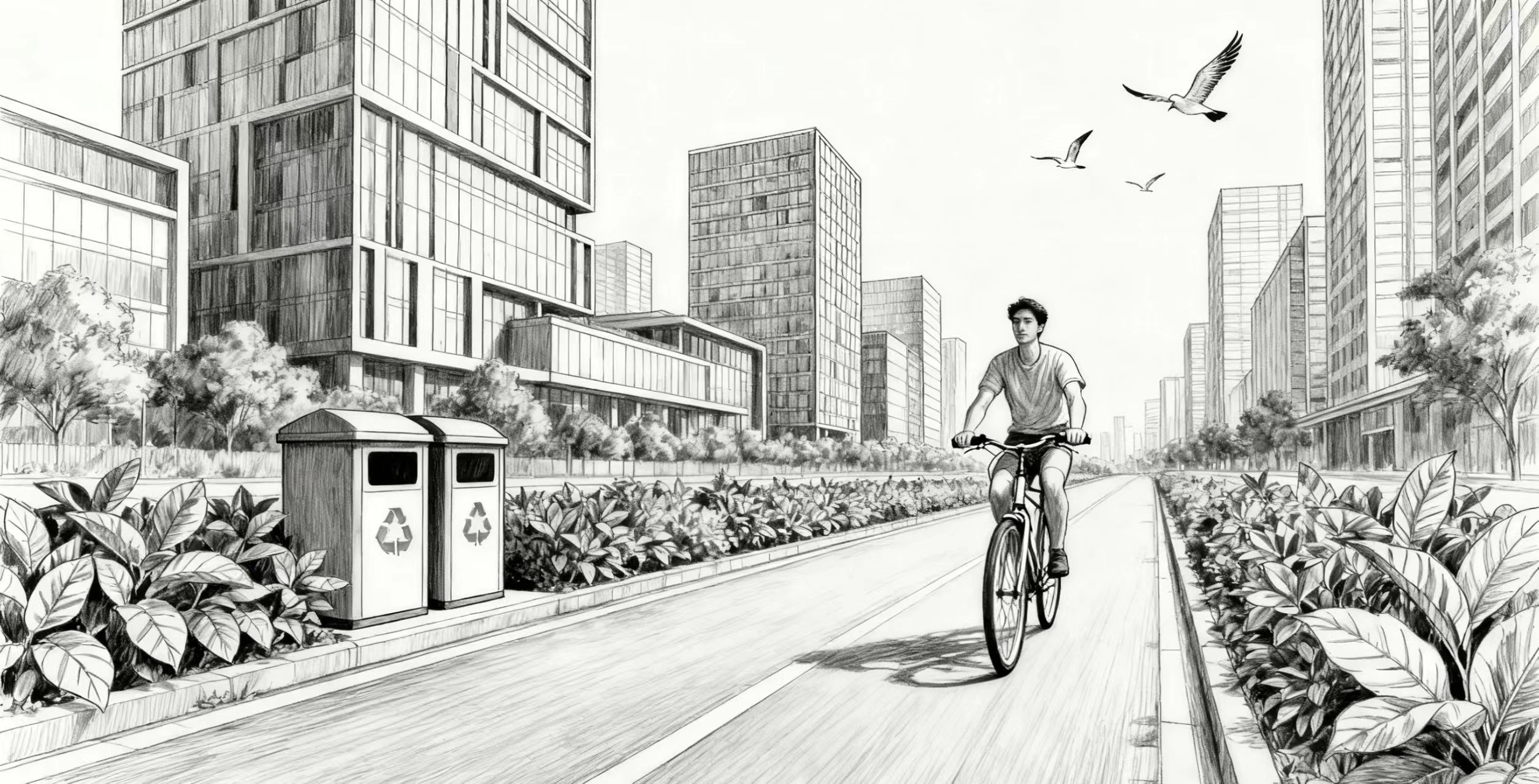 最费心思的是骑行的身影——没画得太快,只让他的衣角轻轻带起一点弧度,连影子都铺得松松的,就像城市里不慌不忙的风。画到飞鸟时忽然觉得,这黑白调子其实不是冷的:摩天楼是骨架,绿植是肌理,而骑行的人、掠过的鸟,都是让这城市"活起来"的心跳。