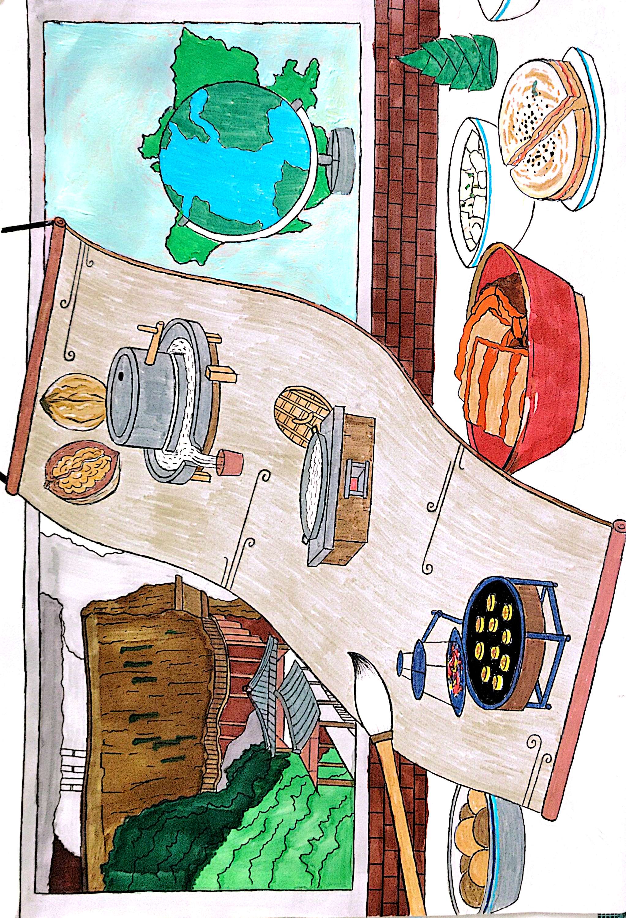这幅画以广元朝天的地域文化为核心,将"明月峡"的自然人文底色、"朝天核桃饼"的非遗制作工序、川北民俗"九大碗"的宴席烟火,与"朝天核桃滚全球"的产业愿景相串联:画面左侧的崖壁栈道是明月峡"蜀道咽喉"的地标意象,卷轴式动线依次铺展核桃研磨、炕饼成型的传统工艺,桌案上的扣肉、蒸菜等则是川北"九大碗"的宴席符号,而右侧的地球仪,暗合"朝天核桃走向世界"的产业图景。 作品以"空间折叠"的手法,让古峡风光、非遗食俗、民俗宴席与全球视野交织——既还原了朝天人"以食为俗"的生活温度,也让明月峡的千年底蕴、核桃饼的酥脆烟火,借由"滚向全球"的意象,生长出传统物产的当代生命力。
