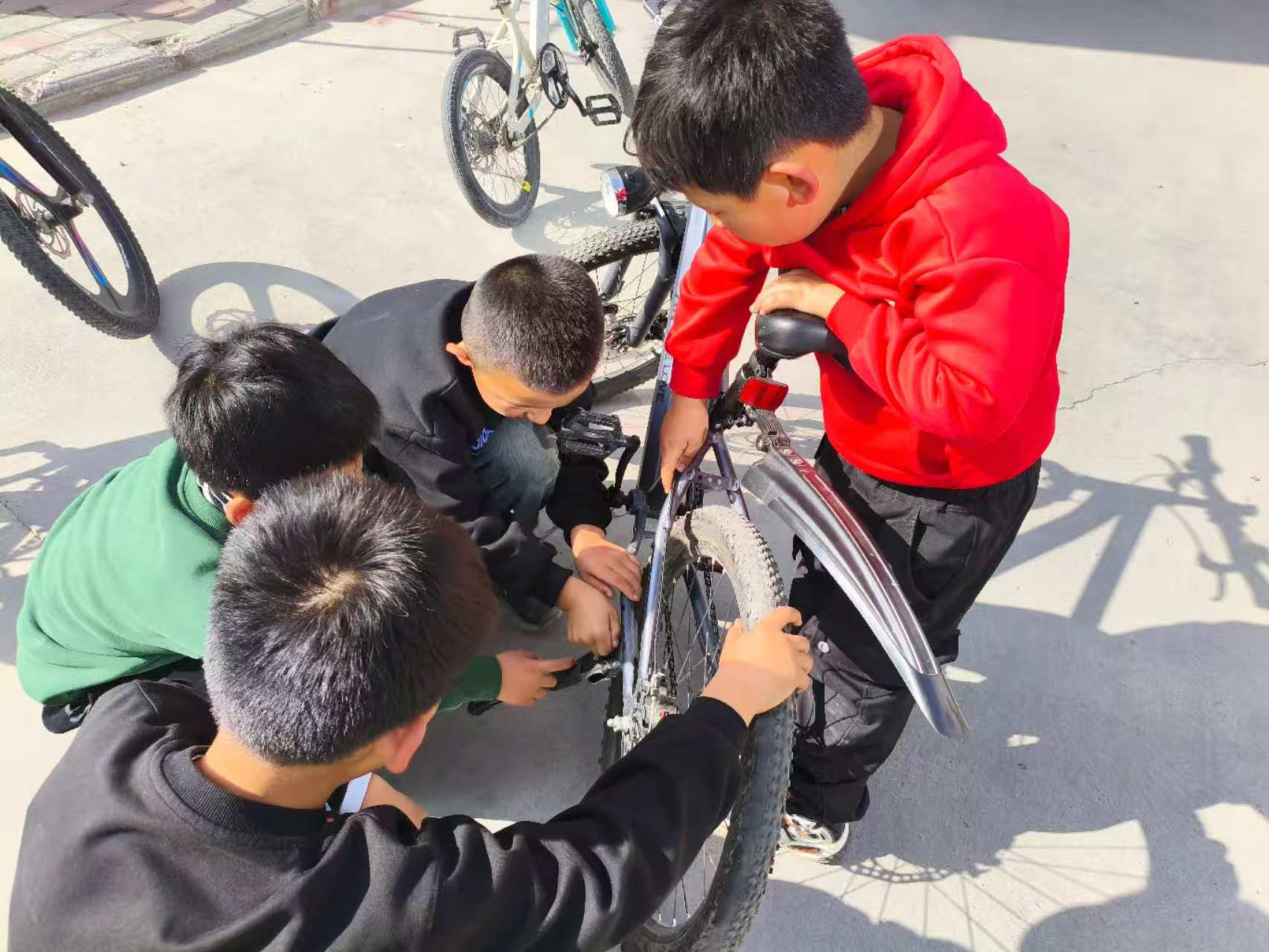 我们常常说团结就是力量,团结是钢,但今天我说团结就是快乐,团结就是幸福。 我们和朋友一块儿去骑车,说是骑车其实也是比赛,我们的目标就是在小区里骑着比赛看看谁的技术好,表演各种动作。 那虽然不是高难度的动作,但是对于车子的性能也是一次检验,特别是表演个急刹车、漂移动作,万一刹不住车子漂移不起来,那可是很丢人的,刚好同伴的车是"豪车"却掉链子了,是真的掉链子了,走不了啦! 怎么办?团结起来,大家出主意拿办法动动小手来修理啊!虽然只是用手,没有专业的工具,团结起来自己修,感动了上天,我们的一致团结大家七手八脚终于发挥了大家的聪明才智,修好了,虽然脸上黑了,但也快乐着幸福着。
