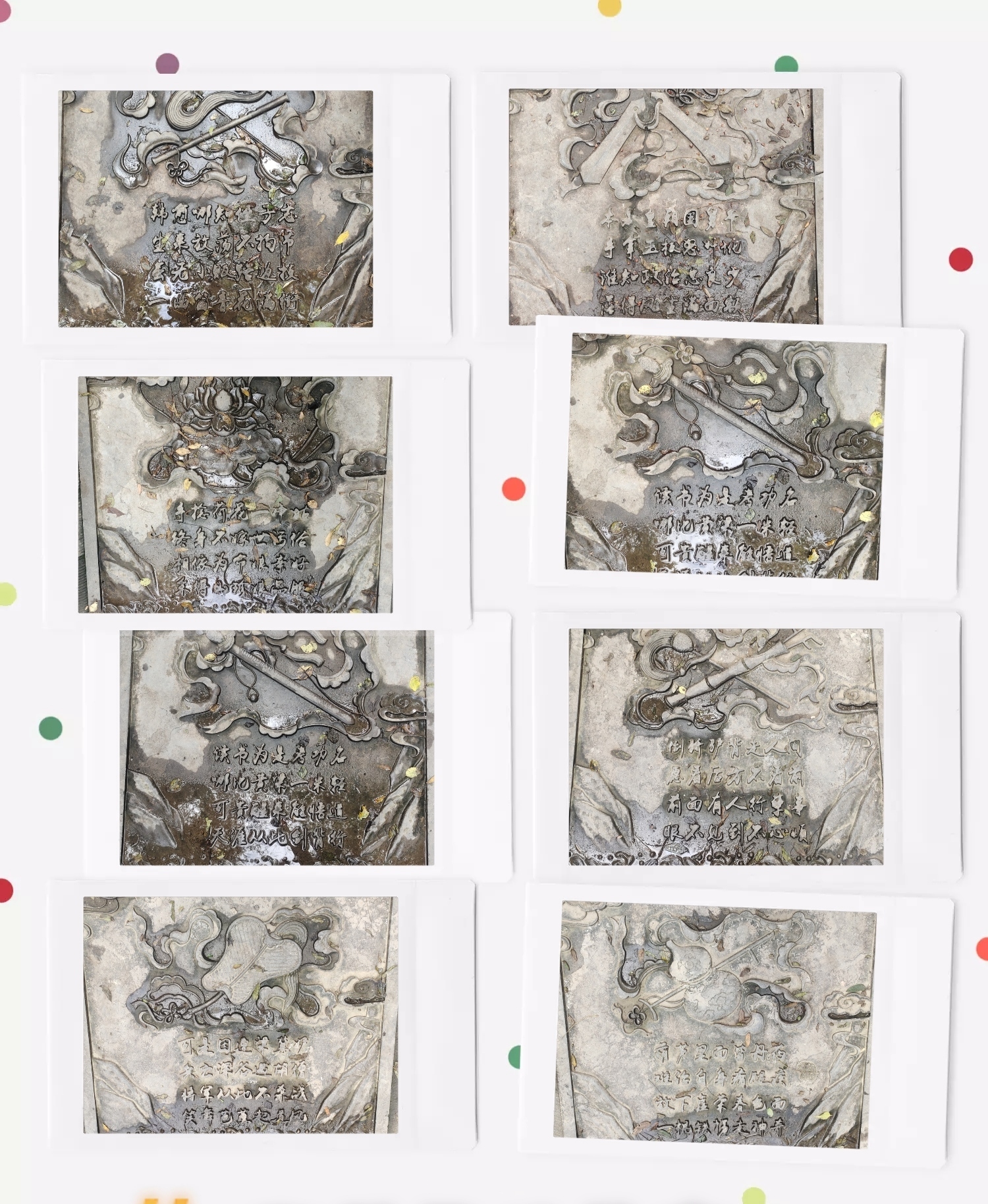 名称:《石上岁月》 这些刻有文字与图案的石板,是时光的留痕。斑驳纹理间,或有往昔的故事、前人的思绪,那些或清晰或模糊的字迹,搭配古朴装饰,似在无声诉说。它们静静陈列,像散落的时光碎片,等待被聆听、被解读,于岁月侵蚀的痕迹里,藏着历史与人文交融的密码,每一块都承载独特记忆,拼凑出岁月长河中的片段 。