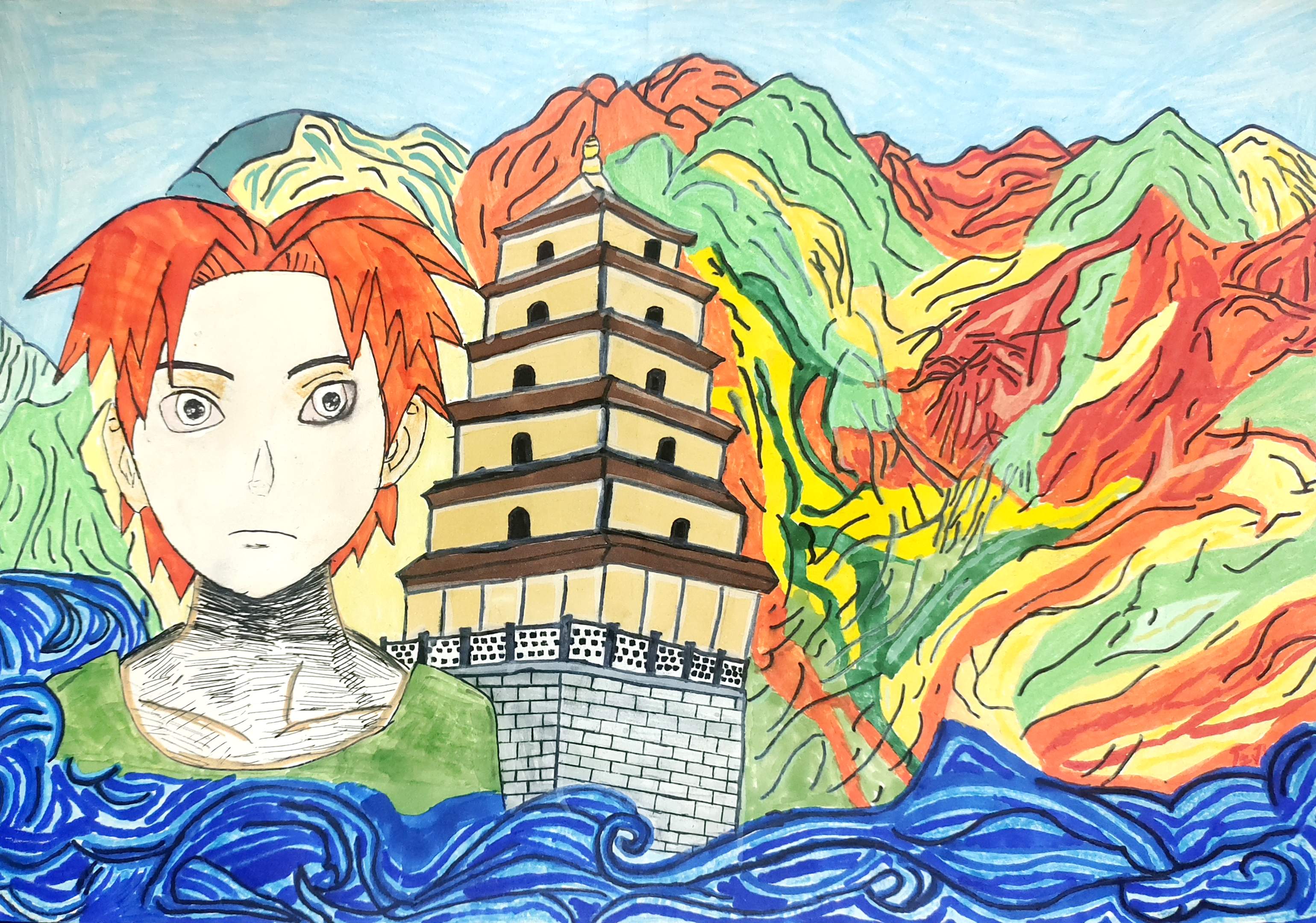 名字:《古韵新像》 这幅画以传统塔楼为中心,色彩斑斓的山峦似流动的诗,海浪翻涌添灵动。红发少年与古韵建筑、山水相融,现代动漫形象碰撞古典景致,打破时空界限,展现传统与新潮的奇妙对话,传递对历史传承与青春活力交融的独特思考 。