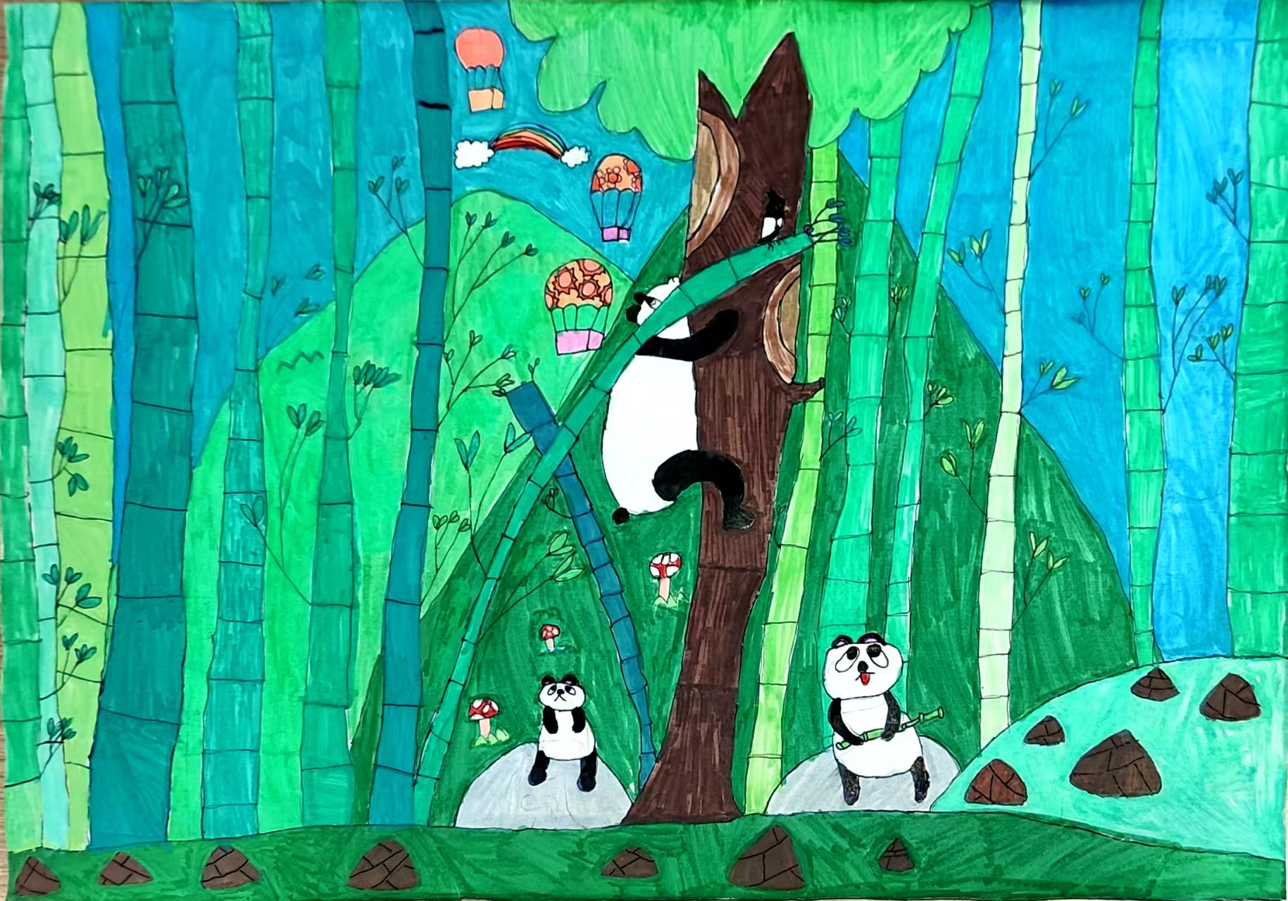 大树是熊猫的"隐身外套",有只熊猫裹在树里,只露白肚子,是不是很会躲?地上的小熊猫正找它呢,眼睛瞪得圆圆的~ 天上的热气球是"观众气球",里面装着小动物在看它们玩,彩虹是给赢的熊猫准备的奖品!我用好多绿色,因为竹林就是熊猫的大游乐园,在这里藏猫猫,连风都会帮它们偷偷躲起来!