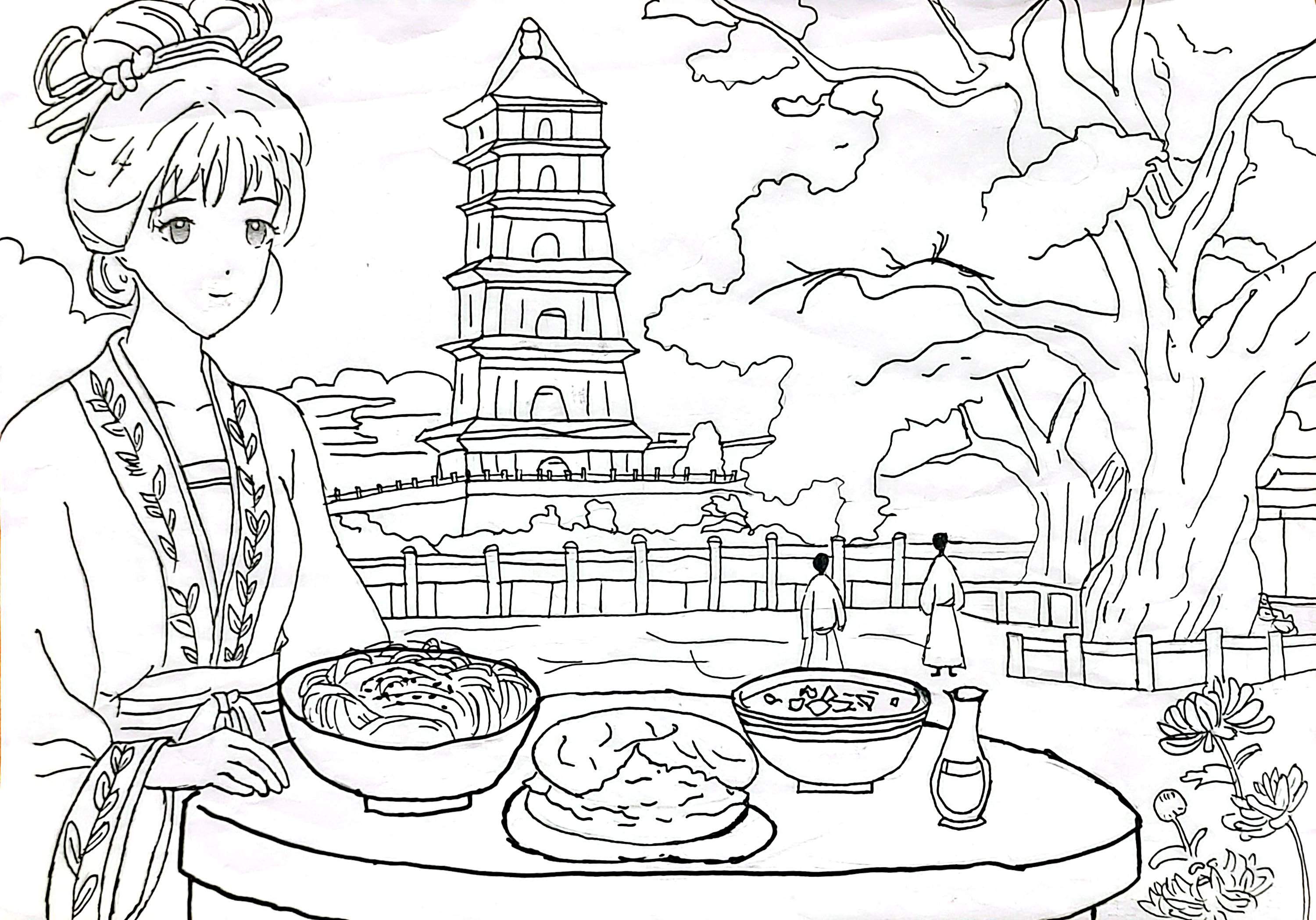 名称:《塔下雅食》 简介:画中展现古风场景,身着传统服饰的女子,于塔下备下佳肴。古朴宝塔巍峨,大树枝叶舒展,远处行人悠然。桌上美食、酒器摆放,营造出闲适的生活氛围。线条勾勒出人物温婉、建筑古朴与自然景致的交融,传递出古代生活里的诗意日常,尽显中式美学中对生活与风景融合的追求 。