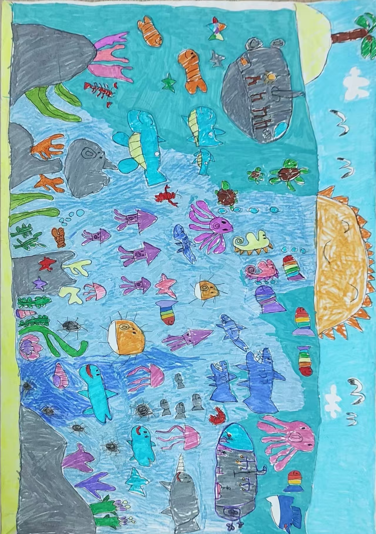 这是海底的彩虹运动会!蓝色的海水是大操场,彩色小鱼是运动员, 大章鱼举着触手当裁判,灰色的潜水艇是给观众坐的看台!太阳在水面上给它们加油。 我画好多颜色,因为运动会就得花花绿绿才热闹,这里的小动物都能得第一名,因为它们都是我最喜欢的海底小选手!