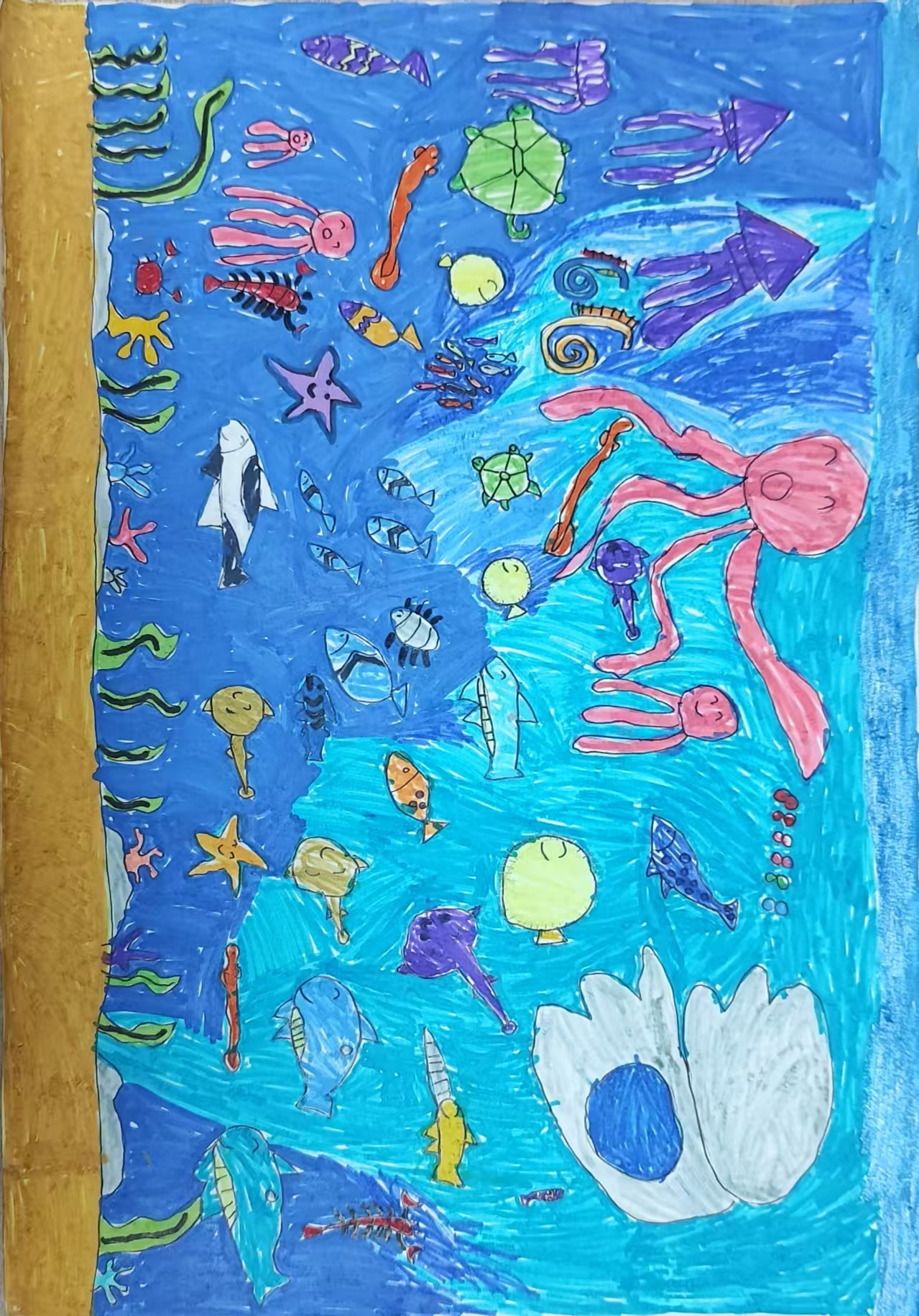 这是海底的游乐场!粉色大章鱼是安全员,举着长触手维护游乐场的秩序 那个大白贝壳是"休息小床",累了就能躺进去!小鱼们挤来挤去好热闹。 我涂满蓝蓝的颜色,因为海底是蓝色的大泳池,这里的小动物都是好朋友,每天都凑在一起疯玩,连海水都在跟着晃呀晃,亮晶晶的好漂亮!