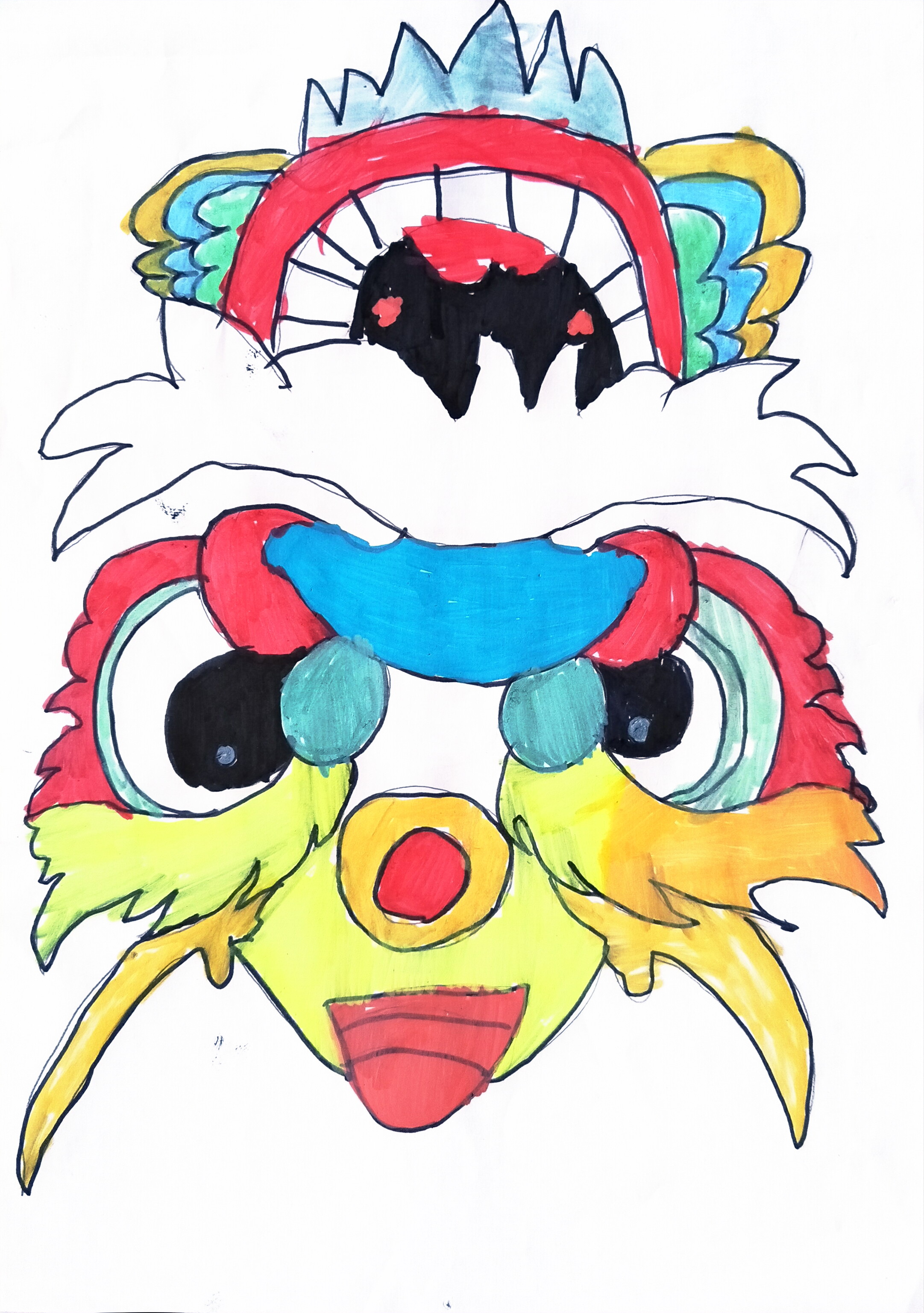 它把醒狮画得灵俏又热闹:红边咧嘴露齿带足锐气,蓝顶、黄颚配着圆溜大眼,像把糖纸色裹在了狮纹里;白绒边柔化了硬朗,撞色纹样裹满孩童式的鲜亮,连眉角的彩羽都透着欢腾。既守了醒狮的传统精气神,又用软萌神态把节庆的热闹劲儿揉得鲜活,像庙会里蹦跳着的彩狮小精灵。