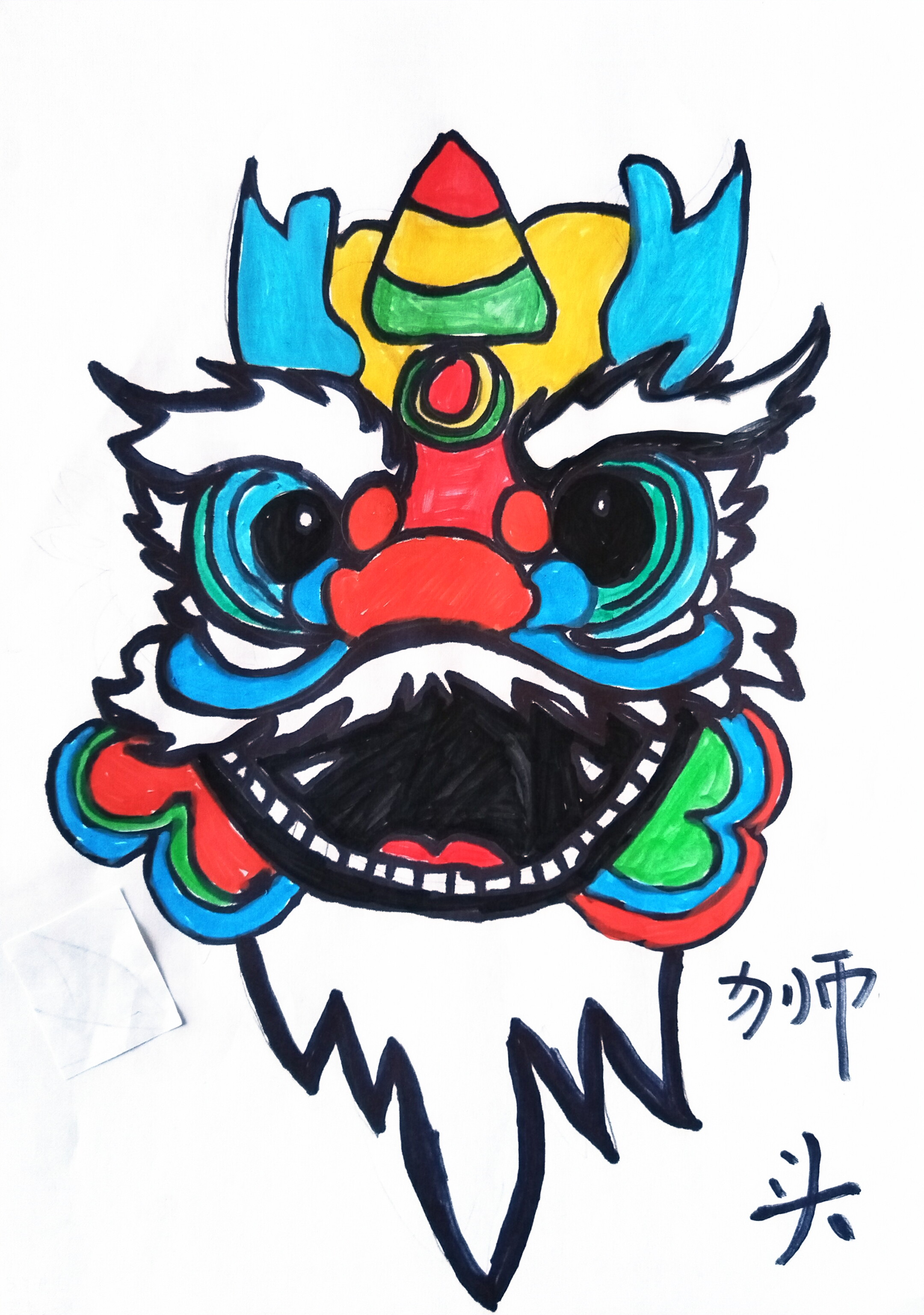 醒狮头以红蓝撞色为主调,额间彩珠、云纹饰角藏着传统纹样,咧嘴露齿的神态裹满节庆锐气,白绒边柔化了硬朗,色彩像把绣线里的鲜亮全铺在了狮面。右下角 "狮头" 题字点明主题,既守了醒狮的文化底色,又用孩童式的浓彩笔触,把庙会的热闹揉成了鲜活的彩绣狮面。