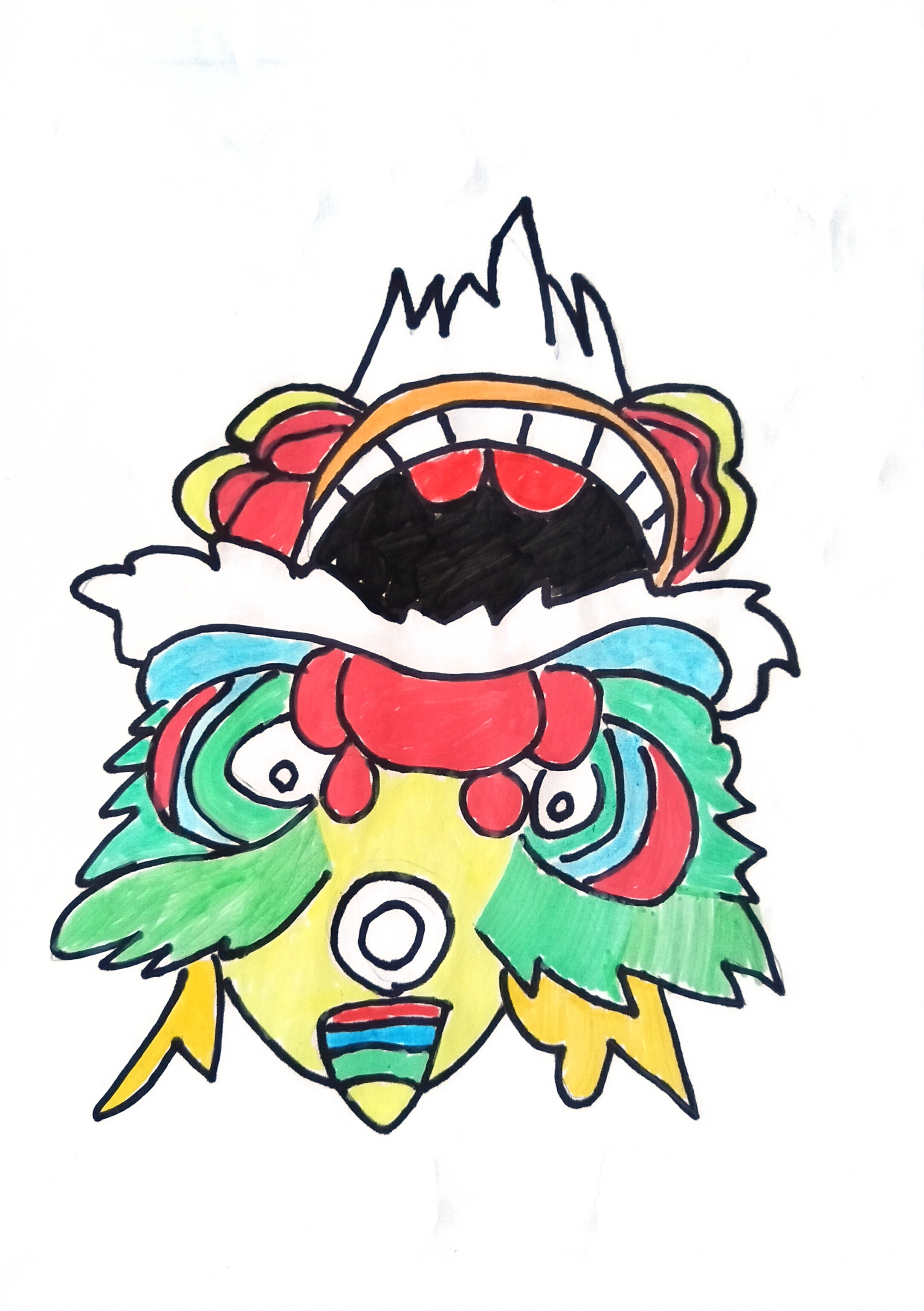 醒狮头以红绿黄撞出鲜活感:咧嘴黑面衬着白齿带足锐气,白绒边柔化了硬朗,额间彩纹、焰状饰角藏着传统细节。既守了醒狮的节庆底色,又用孩童式的明快配色,把庙会的喧闹揉成了俏生生的狮面精灵,连鬃毛都透着灵动的孩子气。