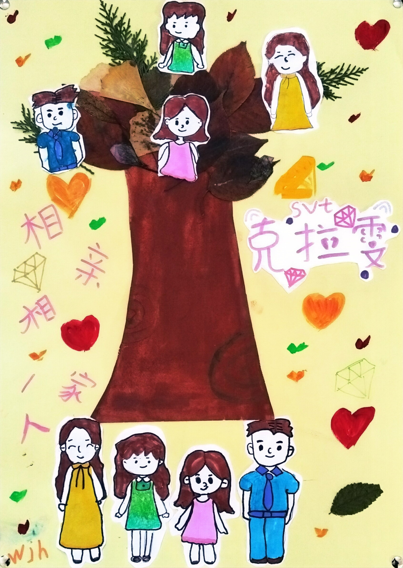 以落叶拼贴成家庭树,手绘家人形象分贴于枝叶与树下(服饰色彩对应呼应成员),既借树的联结感象征家庭温暖,又用 "克拉雯"SVT" 等专属标识融入个性趣味,暖黄底色 + 爱心、钻石装饰烘托 "相亲相爱" 主题,让家人的专属记忆与温馨氛围在创意拼贴里生动呈现。