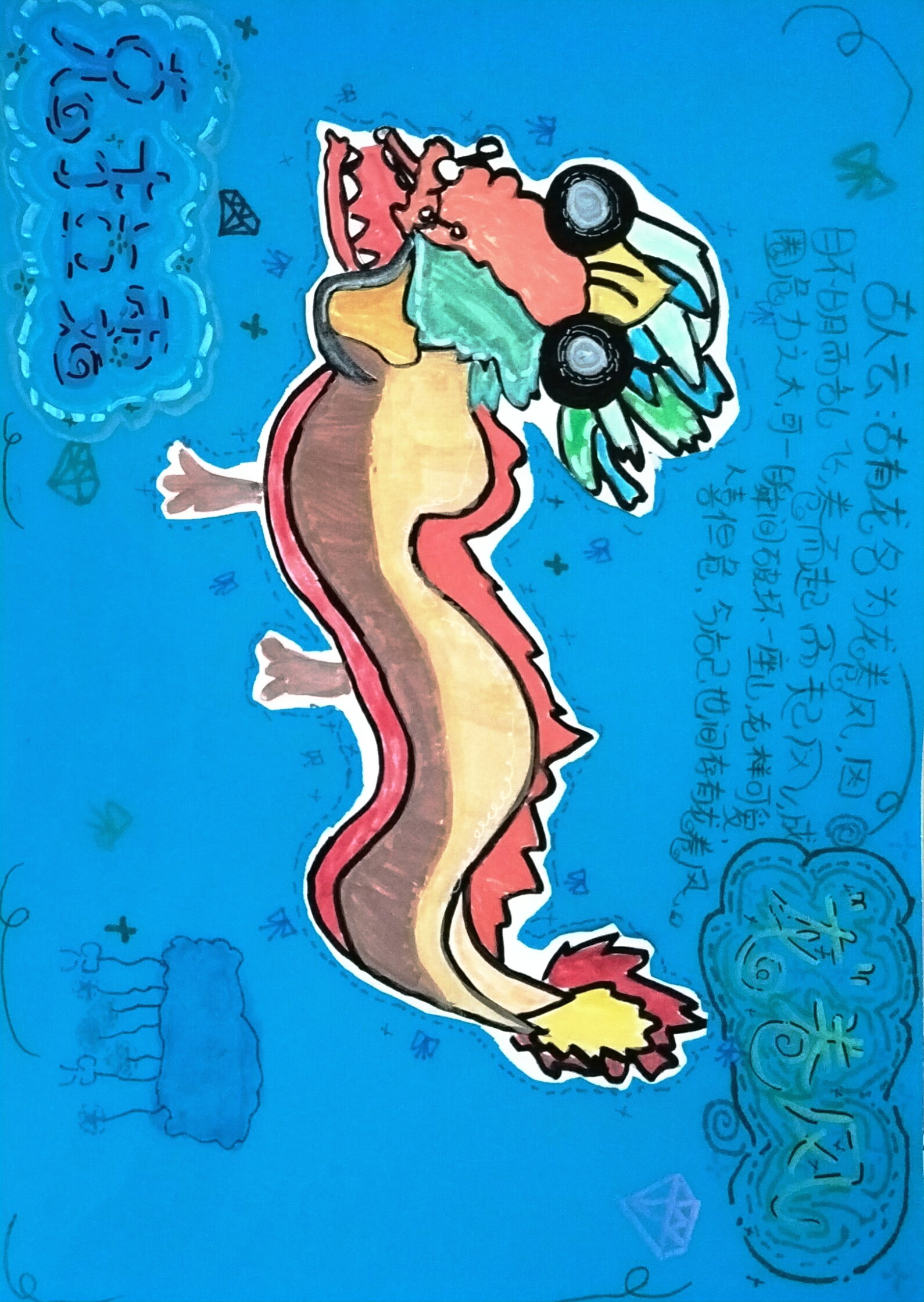 以剪贴手绘创作多彩龙形:红棕主身搭配黄绿装饰,头顶 "车轮" 元素添趣味,辅以 "龙卷风"龙" 老大" 标识,结合文字讲述龙名由来的轻喜剧传说 —— 古人因龙起风命名,又调侃其破坏力如 "龙卷风"。湛蓝底色 + 装饰符号,让传统生肖形象在创意里变得活泼又有故事感。