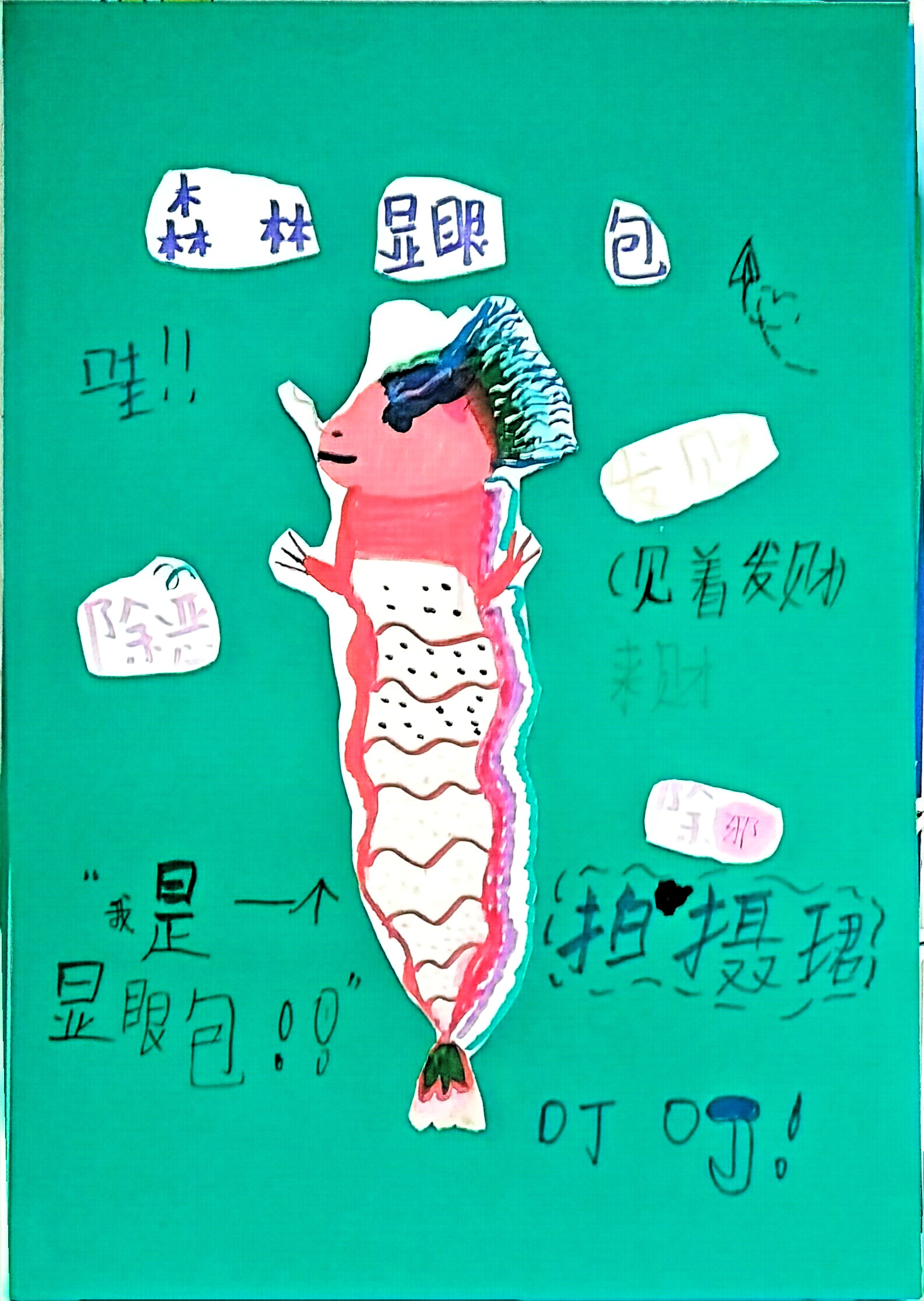 以剪贴手绘创作粉白相间的趣味小龙,搭配 "我是一个显眼包" 的俏皮自白,辅以 "见着发财"除噩" 等吉语,又用 "拍摄摄"哇!" 的搞怪文字增添生活感。青绿底色 + 装饰贴纸,让传统生肖形象跳出严肃框架,变成活泼爱 "刷存在感" 的可爱小龙,把祝福藏在趣味里。