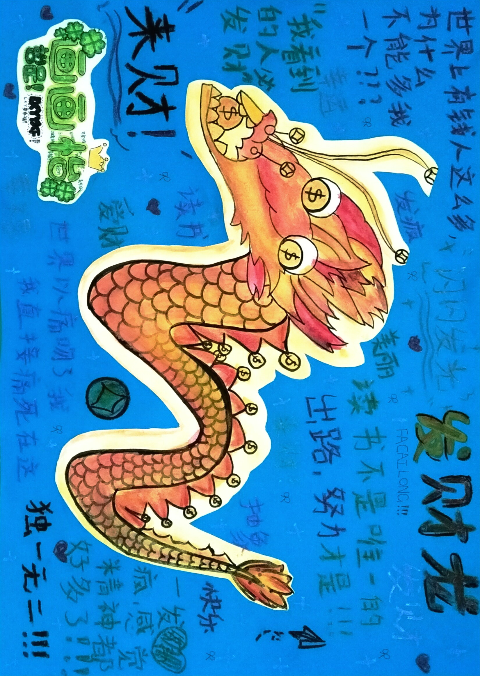 以橙红鳞纹龙为主角,龙身、龙角贴满铜钱元素,搭配 "来财!"发财龙" 的直白祝福,又用 "世界有钱人这么多,为啥没我" 的搞怪吐槽,让传统吉祥龙变身为 "财迷显眼包"。湛蓝底色 + 碎碎念文字,把求财的可爱小心思藏进生肖创意里,既保留吉祥寓意,又添生活趣味。